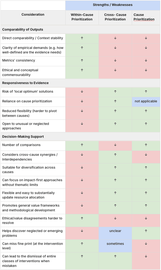 It's striking that, at least in the context of the organizations above, the revealed effort devoted to within-cause area prioritization is about 9 times that allocated to cause prioritization and cross-cause prioritization combined.[17] Perhaps there are practical considerations that justify this distribution, but it's also possible that this simply isn't the optimal allocation of efforts among the different types of prioritization work. Let us consider the strengths and weaknesses of each type next.