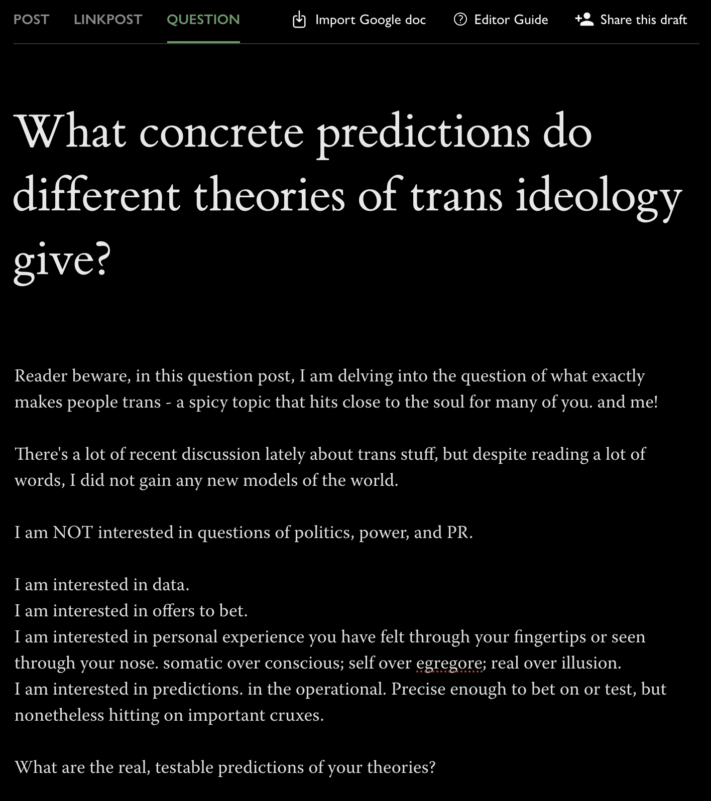 btw i transitioned because ozy made it seemed cool. his says take the pills if you feel like it. that's it. decompose "trans" into its parts: do i like a different name, do i like these other clothes, would i like certain changes to my body?