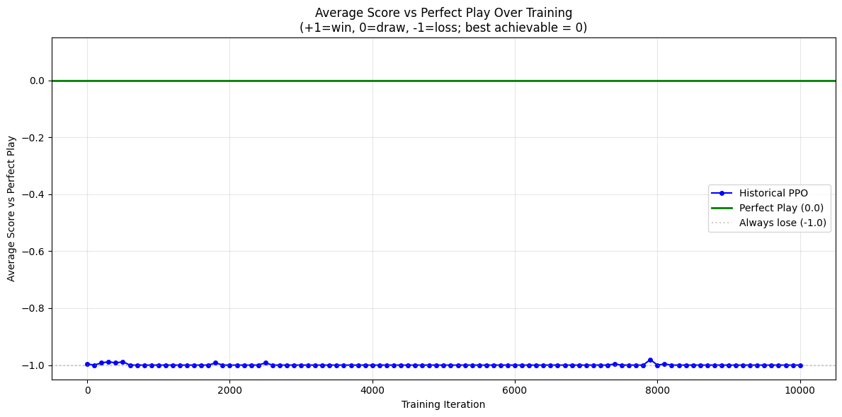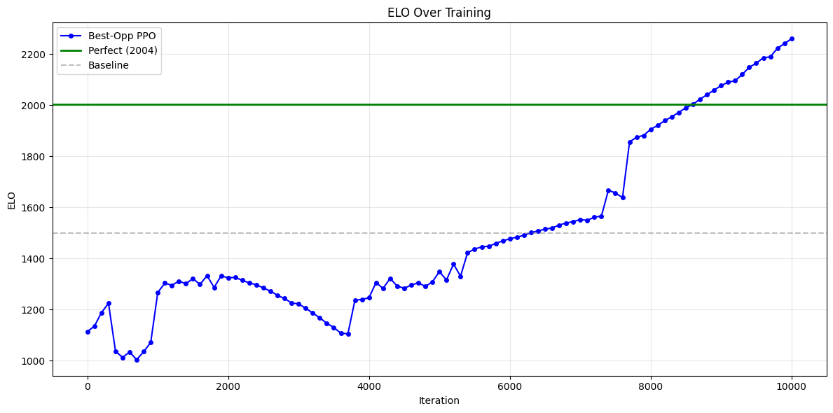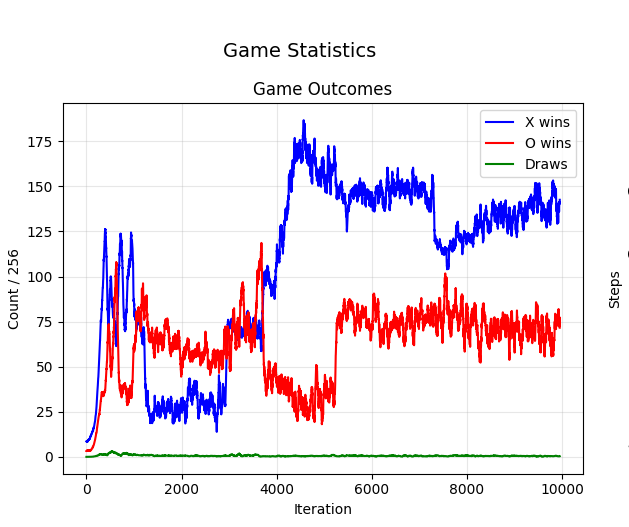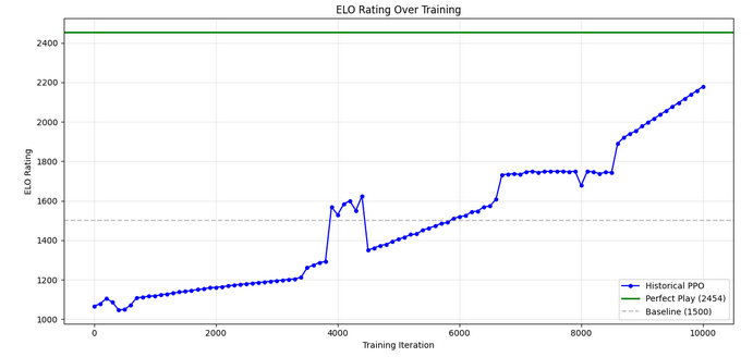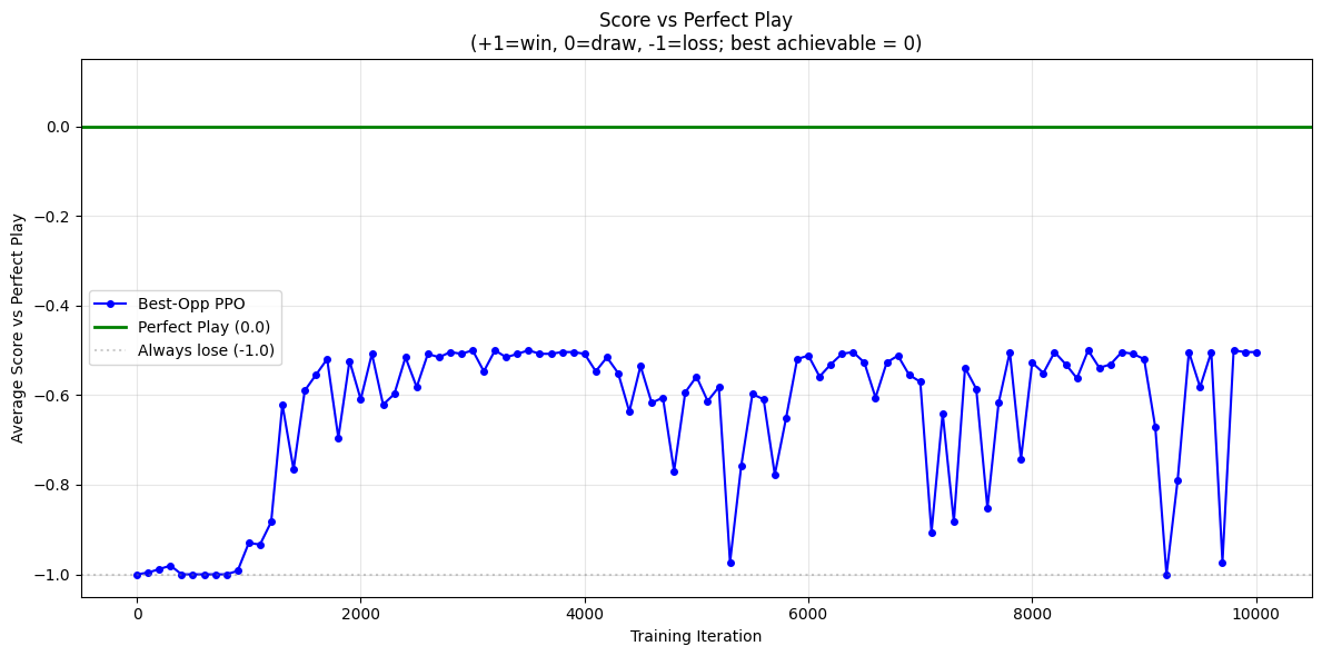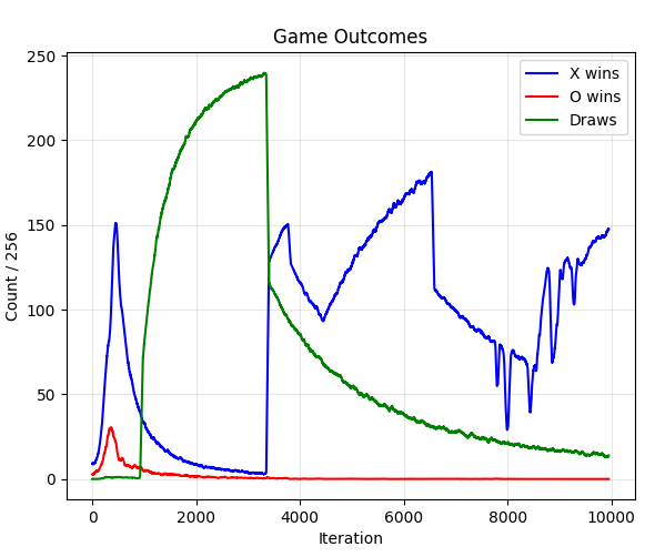 A problem I was thinking about was that while we have algorithms to optimize LLMs to maximize a reward, we don’t have algorithms to optimize them for maximin objectives. While simultaneous PPO has been used in some experiments[12], it could undergo instabilities over time, with “two agents chasing around each other." Approaches such as AlphaZero can’t be used for LLMs since the action space is exponentially larger than in chess. However, the closest thing we have is AlphaStar [https://storage.googleapis.com/deepmind-media/research/alphastar/AlphaStar_unformatted.pdf], a neural network that can beat humans at the game StarCraft, which was pretrained with real user data and then trained with multi-agent RL. The key to avoiding instabilities was experience replay, meaning playing against previous versions of the agent. For LLMs, this can be done limitedly, since saving checkpoints is expensive. I tested two versions of replay with PPO for neural networks trained to play TicTacToe and a version with no replay, both using “inverse momentum/optimistic gradient descent (OSGD)” regularization and without.