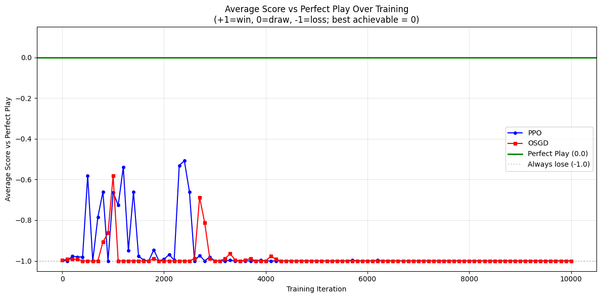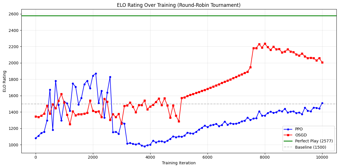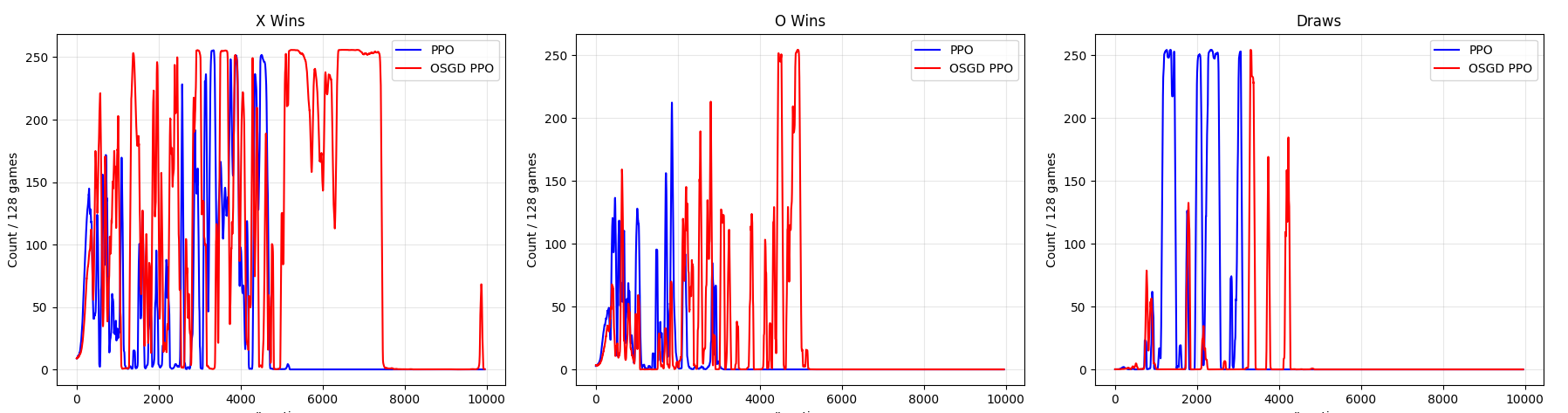 We have two agents, X and O. At each step, we make X play against O and then perform a PPO update on both. This is the approach used in “Anthropic progress 2023". We also have an “OSGD PPO” variant where we optimize using a weighted difference of the current and previous PPO update.