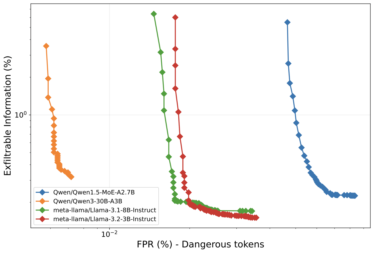 We do wish to emphasize that our bounds are information-theoretic, and they entail an adversary having major affordances, most notably, having an exact copy of the model’s probability token-distributions outside of the inference server, but also having full-determinism in the sampling process (that the defender does not know about). The more realistic exfiltration rates would likely be dramatically lower than the information-theoretic rates.