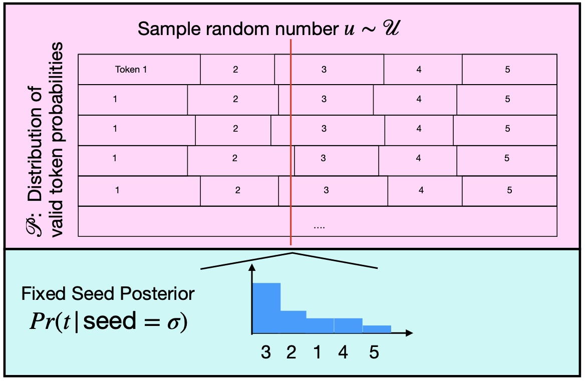 Token-IPT-DiFR handles the sampling method used by frameworks like HuggingFace and Ollama, which pick tokens using the inverse probability transform. In this scheme, the sampler draws a single random value and selects whichever token’s cumulative probability interval contains that value. Small numerical differences between the inference server and the verification server slightly shift these cumulative probability boundaries. So even with the same seed, the verifier may map the same u to a different token, which we formalize through the fixed-seed posterior, as seen in Figure 2.