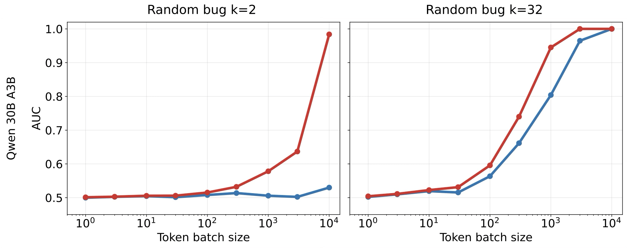 Thinking Machines found something similar: generating 1,000 completions of 1,000 tokens each at temperature zero with Qwen3-235B produced only 80 unique outputs, all with identical first 102 tokens. And we find similar results.
