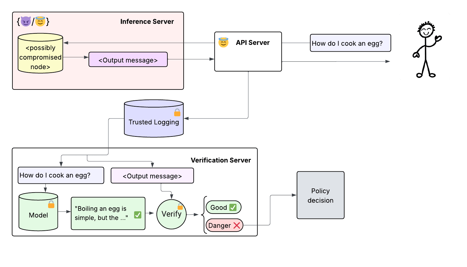 Operationally, the overhead of deploying inference verification is extremely small. We observe that this problem is essentially the classic statistics problem of drawing a red ball from a bag of colored balls: if even 1% of outputs were maliciously altered, then sampling a tiny fraction of them is enough to ensure, at arbitrarily high confidence level, that you would catch at least 1,000 malicious messages (see Section 4.1 of our paper). Our estimate is that dedicating roughly one verification GPU for every ~200,000 inference GPUs is enough to detect malicious exfiltration with 99.9999% confidence.