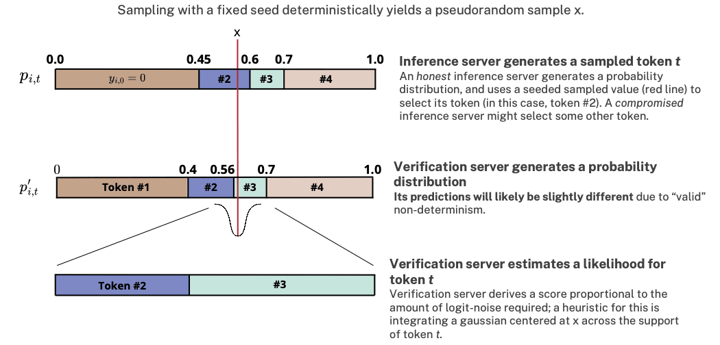 A core technical contribution of our work is formalizing what counts as “acceptable” non-determinism. We define the Fixed-Seed Sampling Likelihood (FSSL): given a seed and a claimed token, what's the probability it could have been honestly produced under normal numerical noise?