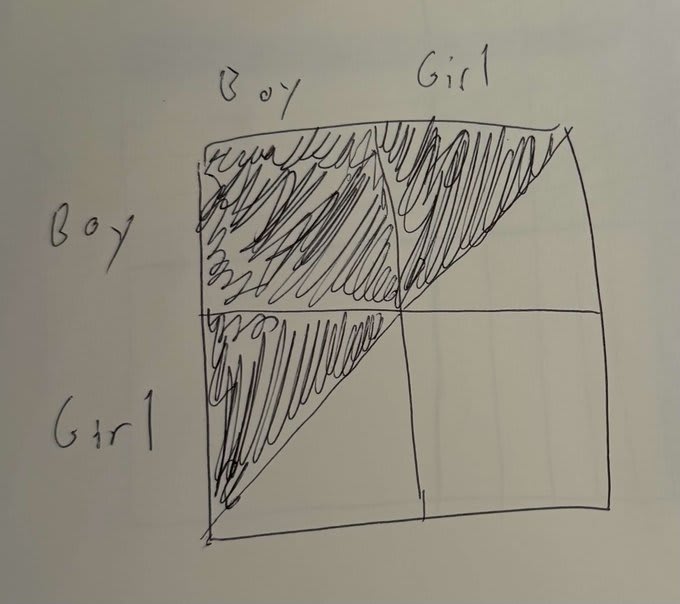 So the probability of boy-boy is (2N-1)/(2N-1 + N + N) = (2N-1)/(4N-1).
