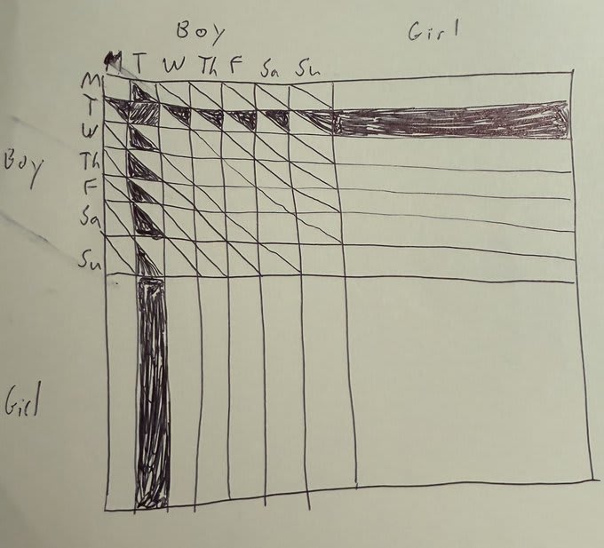 The shaded half-squares conveniently make the (boy, boy) quadrant's shaded part add up to 1/49 + 12(0.5/49) = 7/49, just like the (boy, girl) and the (girl, girl) quadrants' masses do, allowing us to rationally answer the puzzle with our a-priori probability of 1/3.