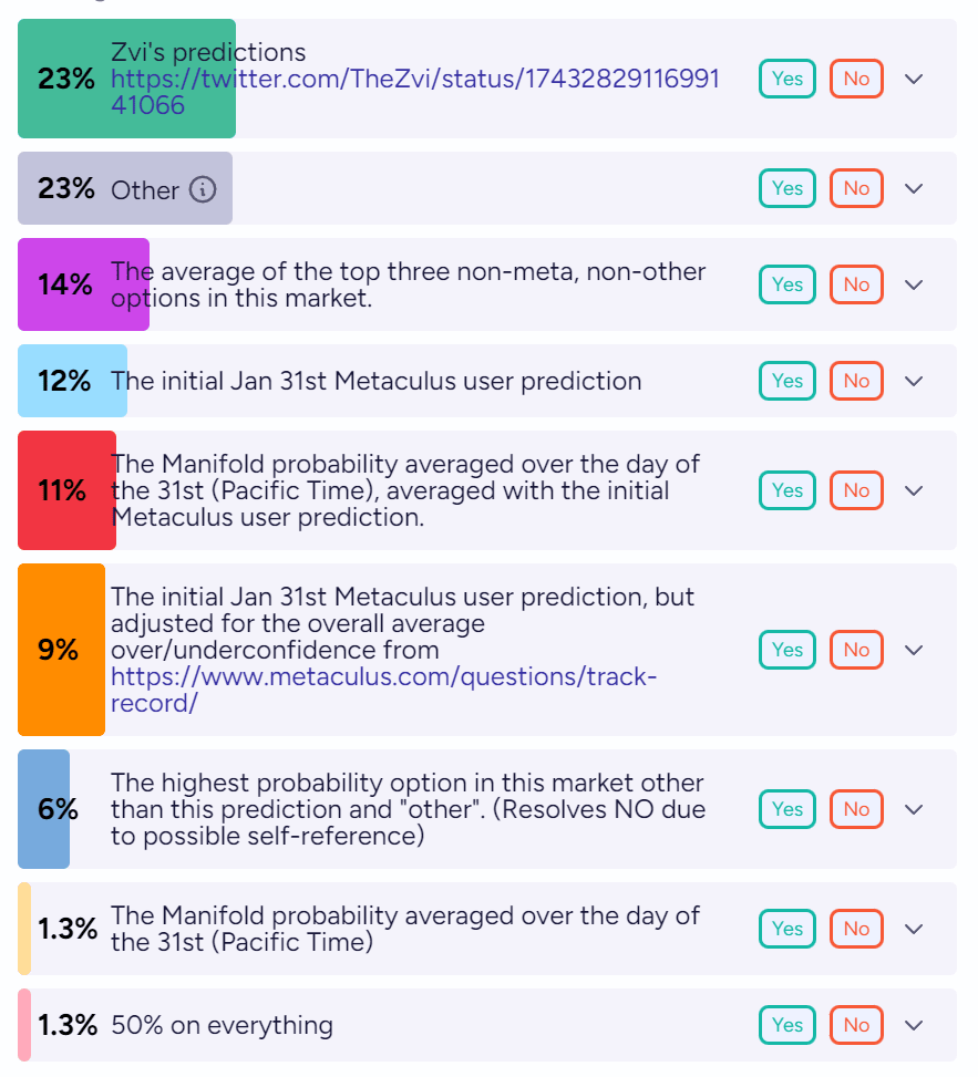 I am considering whether to do a second prediction post with select additional markets, the more good topics I have the more likely I am to do it. I am less interested in elections, especially foreign elections, where the research seems not useful, more interested in developments in AI or that otherwise feel impactful, including longer term questions, and also in personal stuff,, which I’ve been experimenting with. Don’t forget to check out my questions for ideas if that appeals to you.
