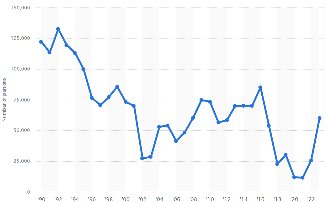 This has not happened since the early 1990s. They peaked at 85k under Obama in 2016 before declining under Trump, then Covid crashed the numbers, now they are picking back up with 60k in 2023. What is described as a ‘migrant crisis’ seems to me more along the lines of standard historical precedent? This is what happens when you don’t have a Trump or post-9/11 crackdown?