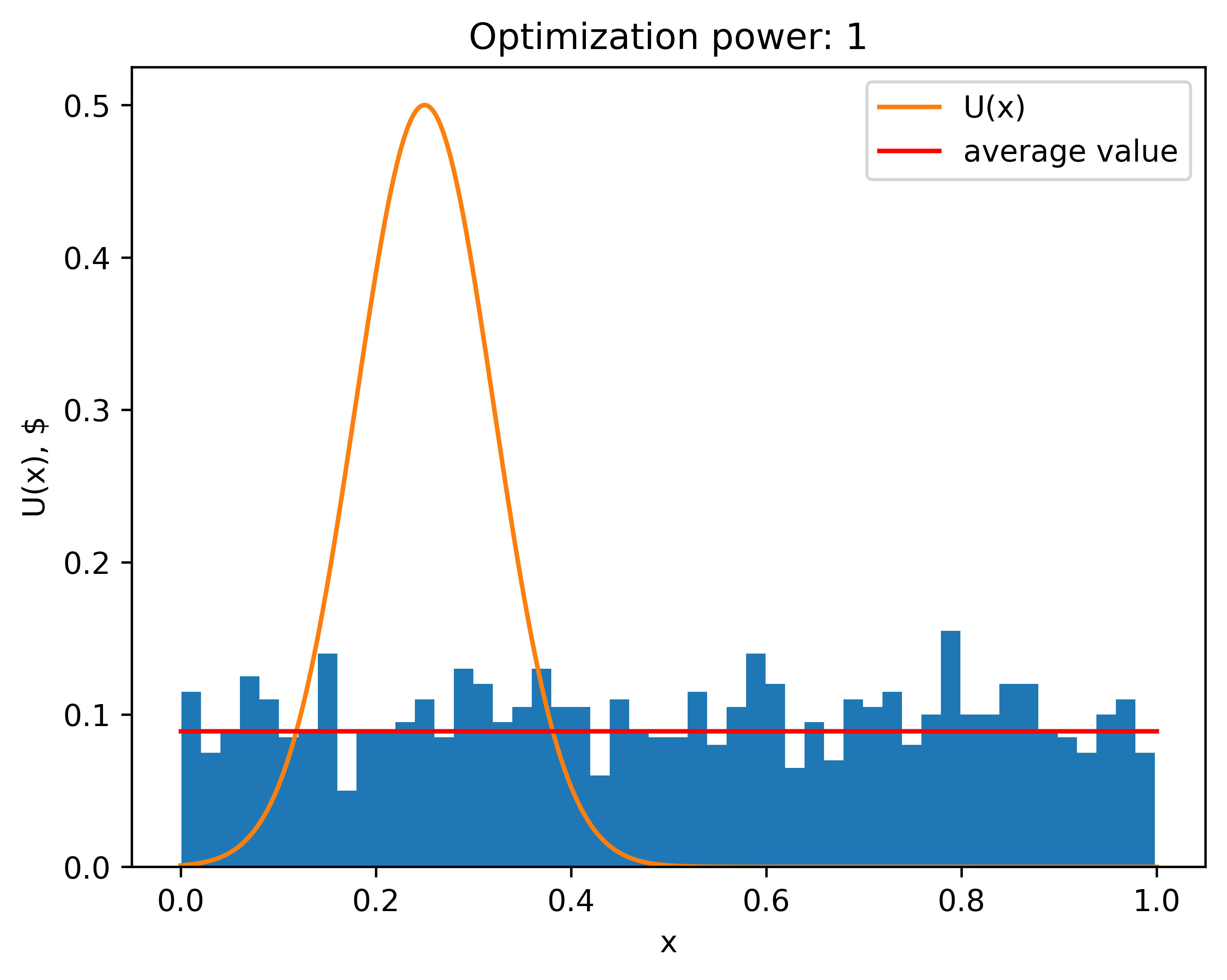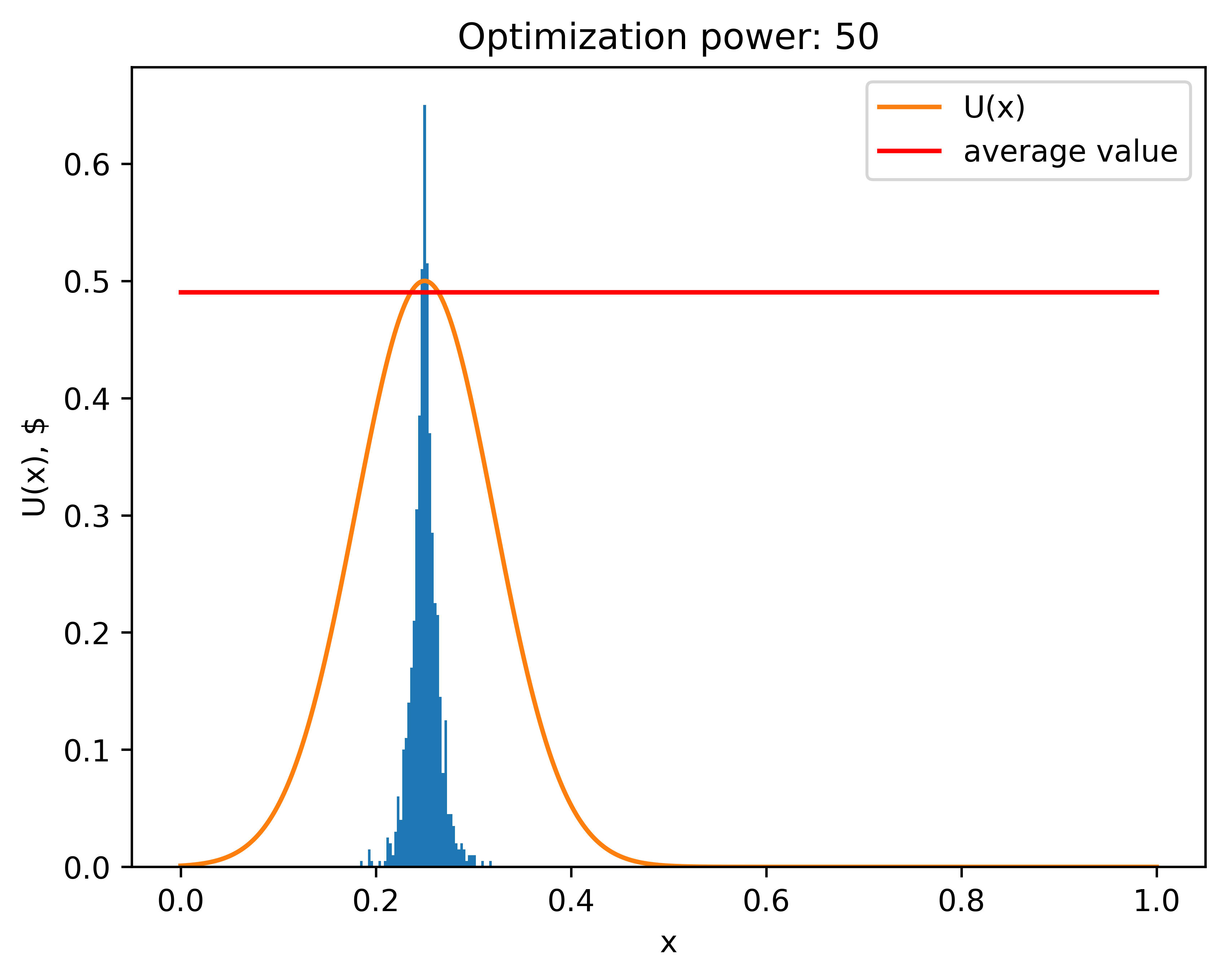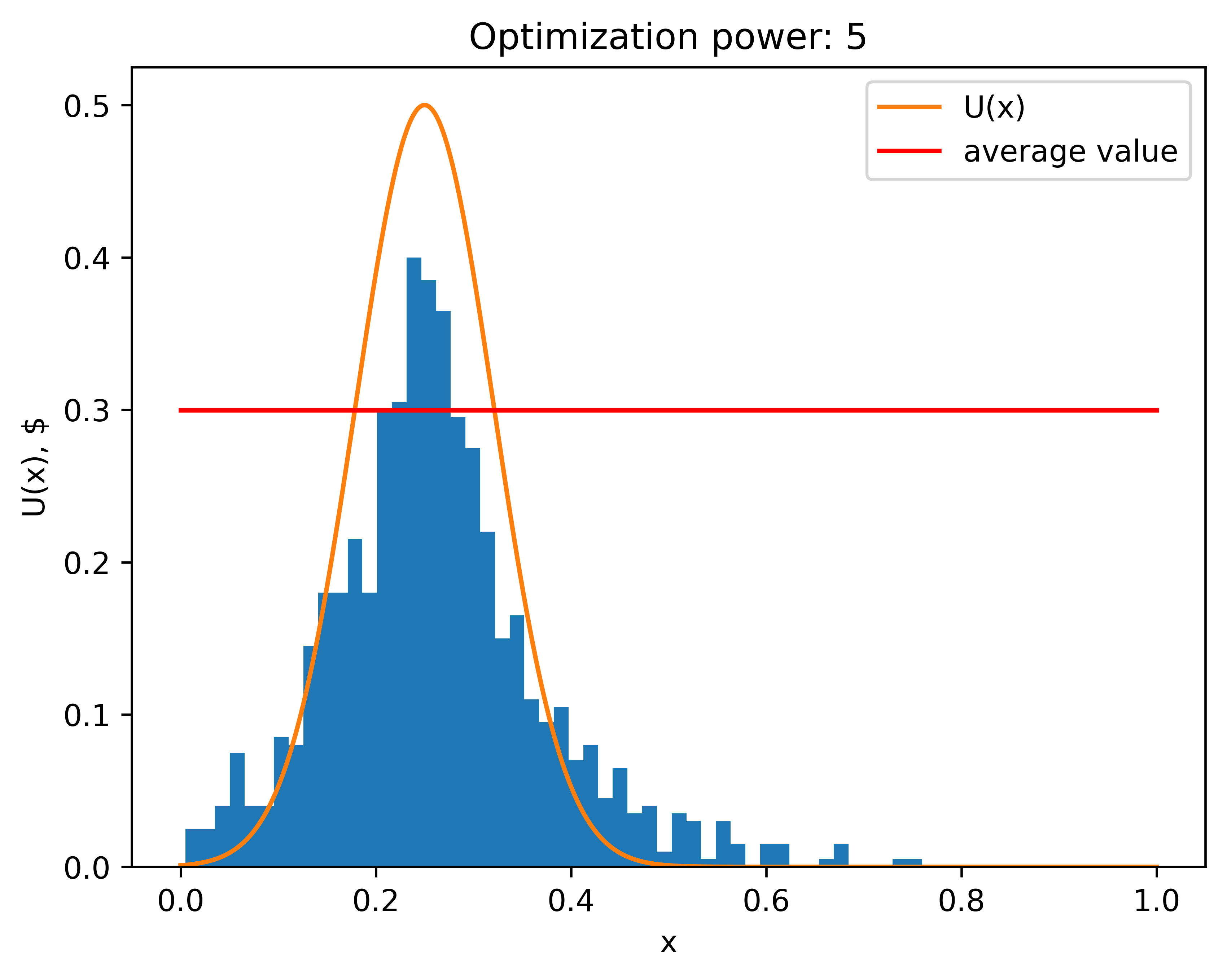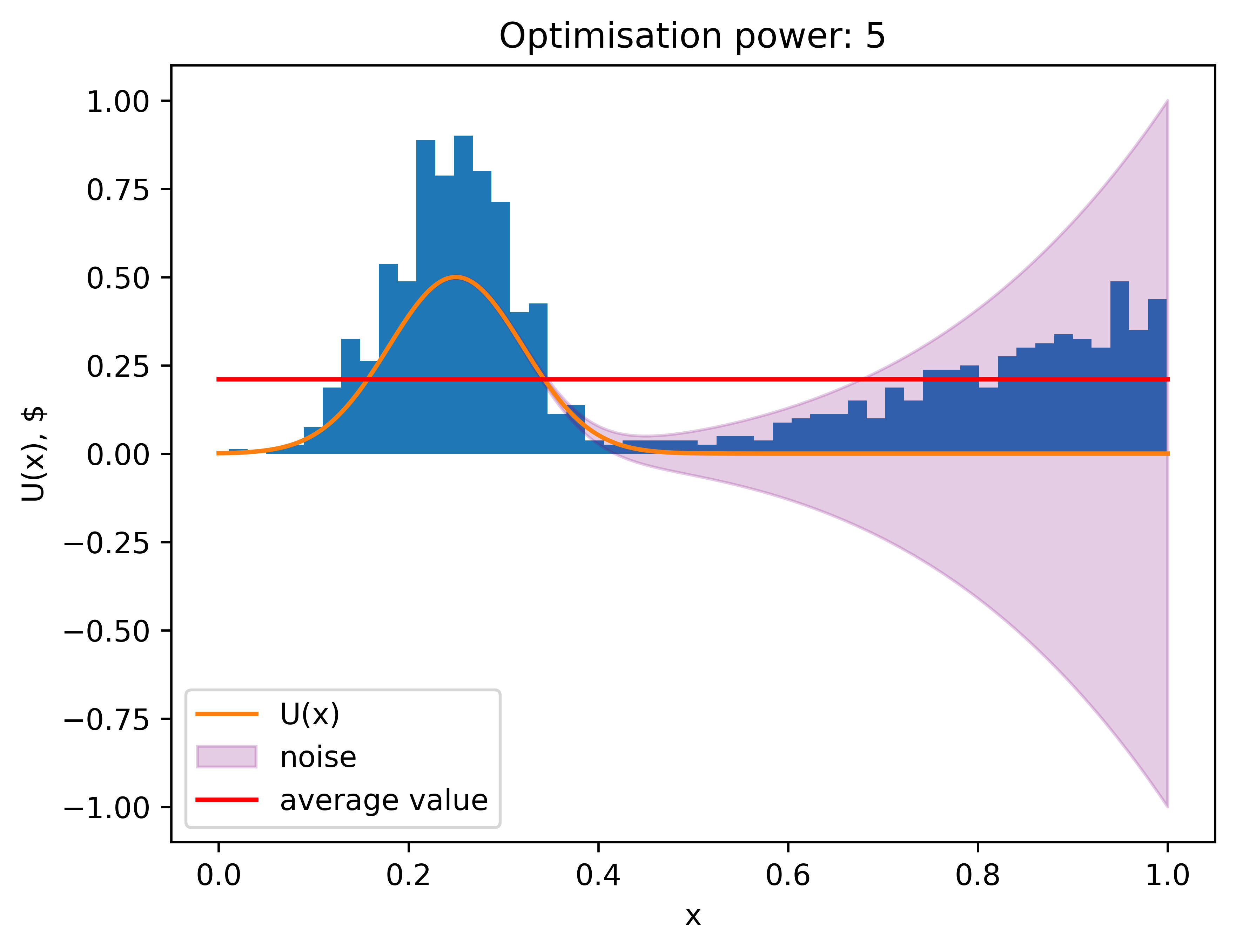 Here are 1,000 such experiments, in each of which the optimization power was 5. The bar chart is the probability density of the proxy maxima chosen by the Algorithm 1.[2] We can see that points are clustering around the true maximum point (x=0.25). The “average value” is the average of the utility function U Veronica obtains from those proxy maxima (the expected amount of money she makes with this algorithm). It is noticeably smaller than the actual maximum value she can achieve.