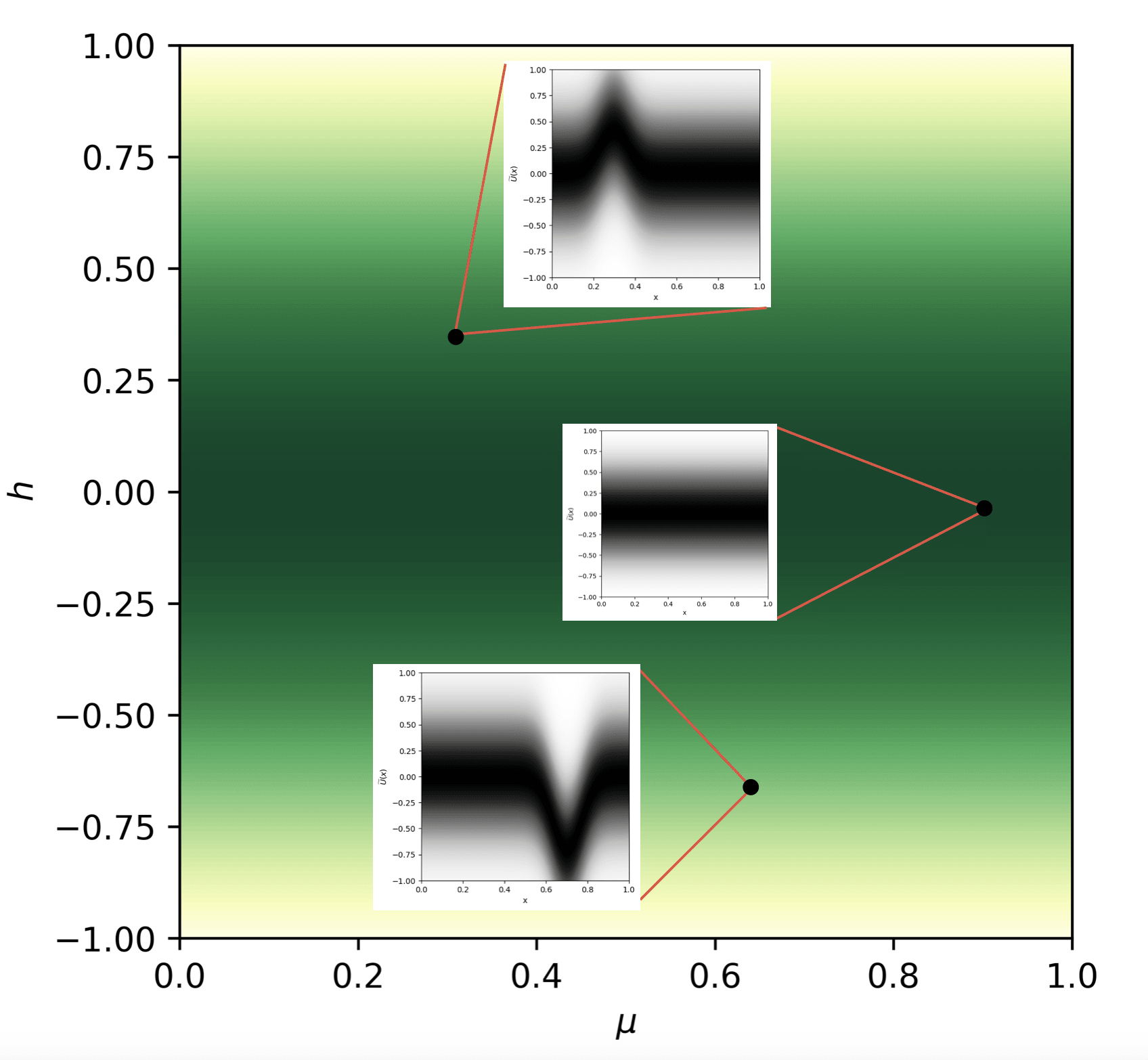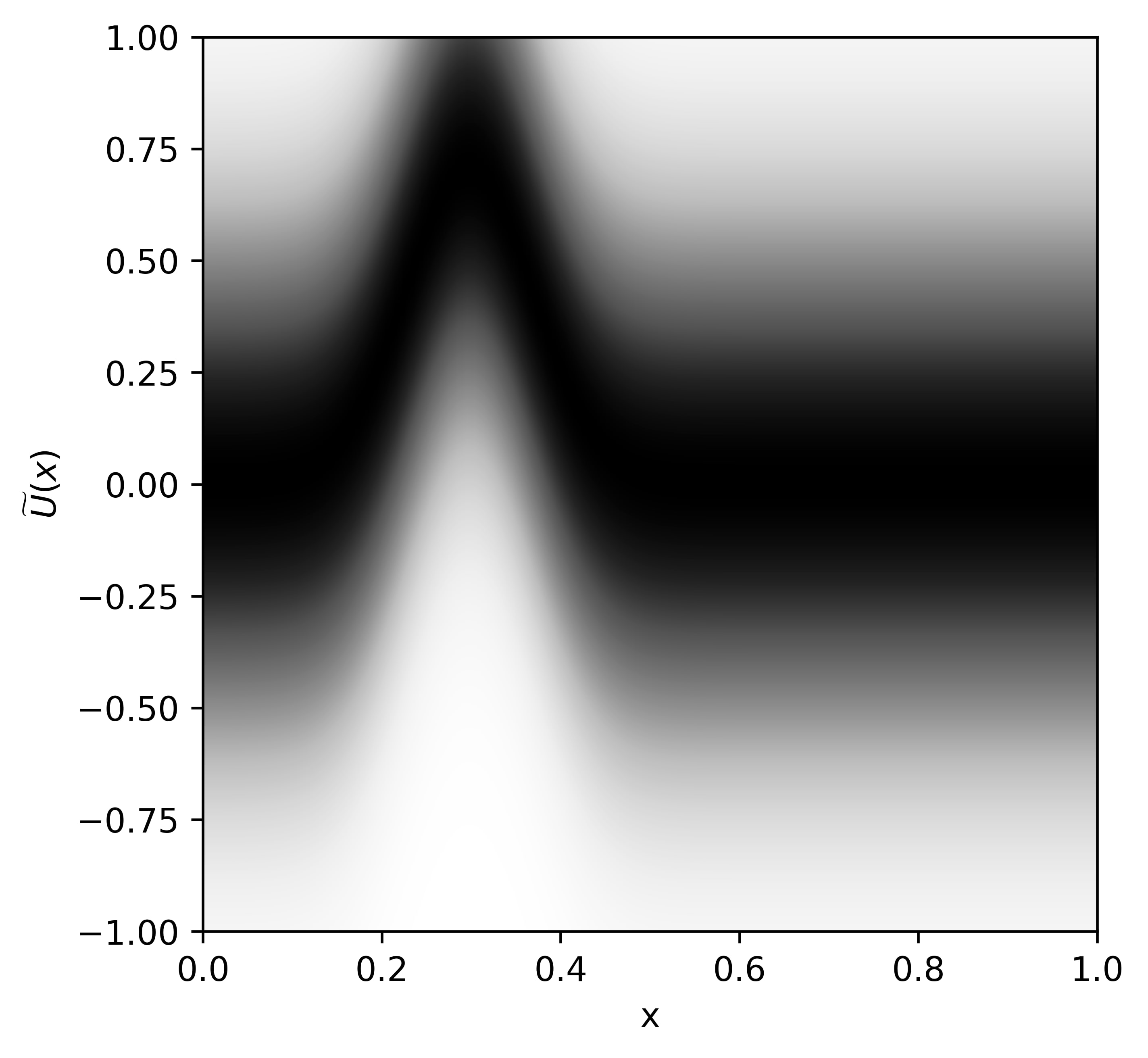 Colormap of one such hypothesis (which shows with what probability each pair (x,˜U(x)) can be outputed) with a specific value of peak hight h=0.7 and x-coordinate of this peak μ=0.3 would look like this (the blacker the region, the higher the probability):