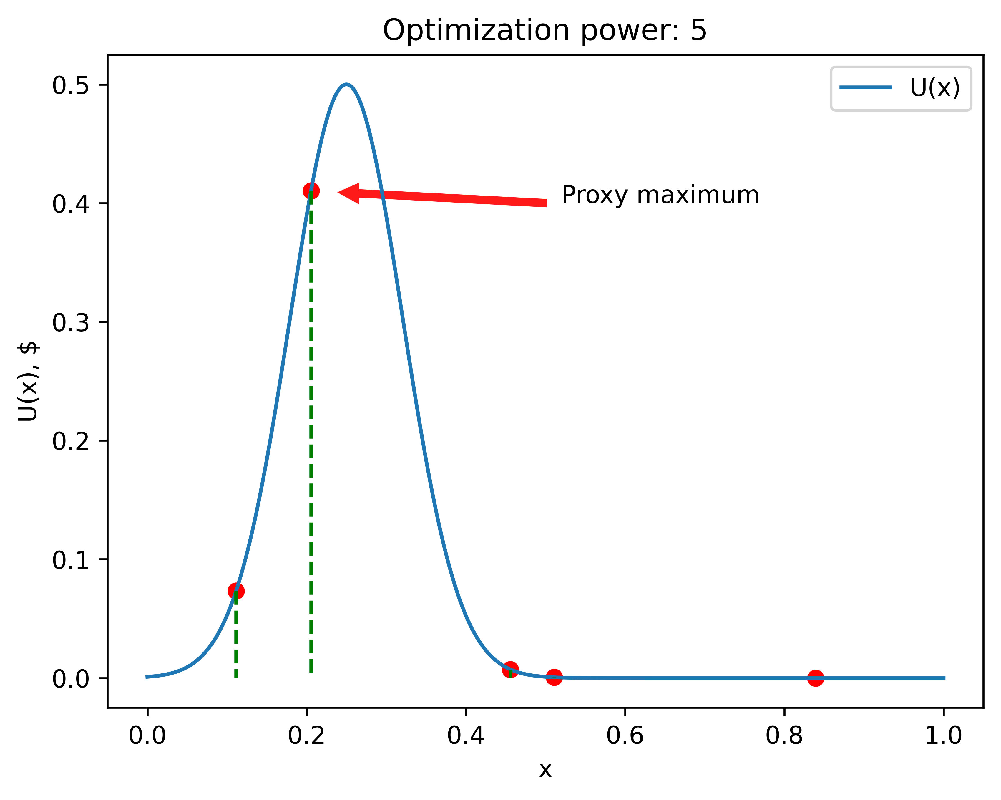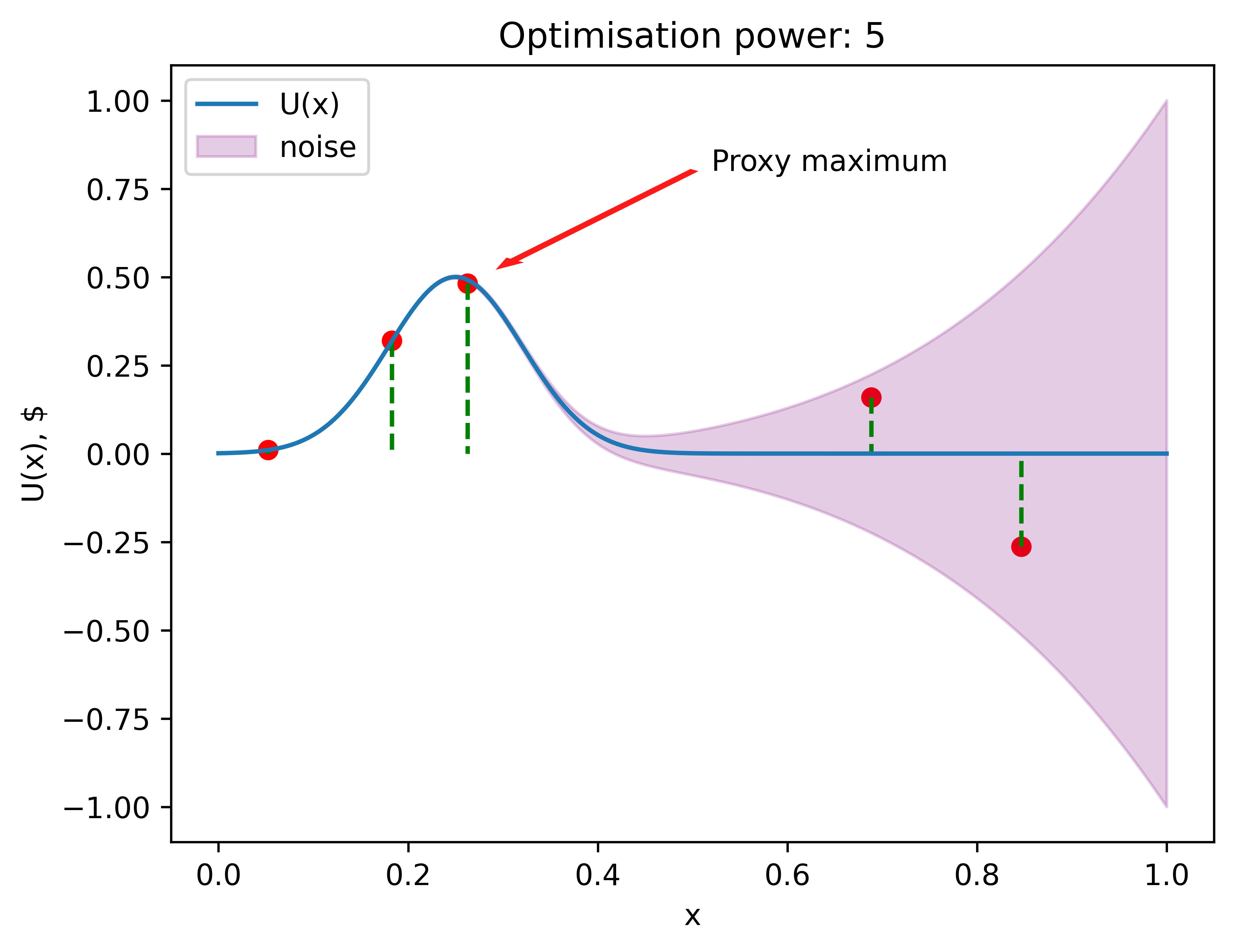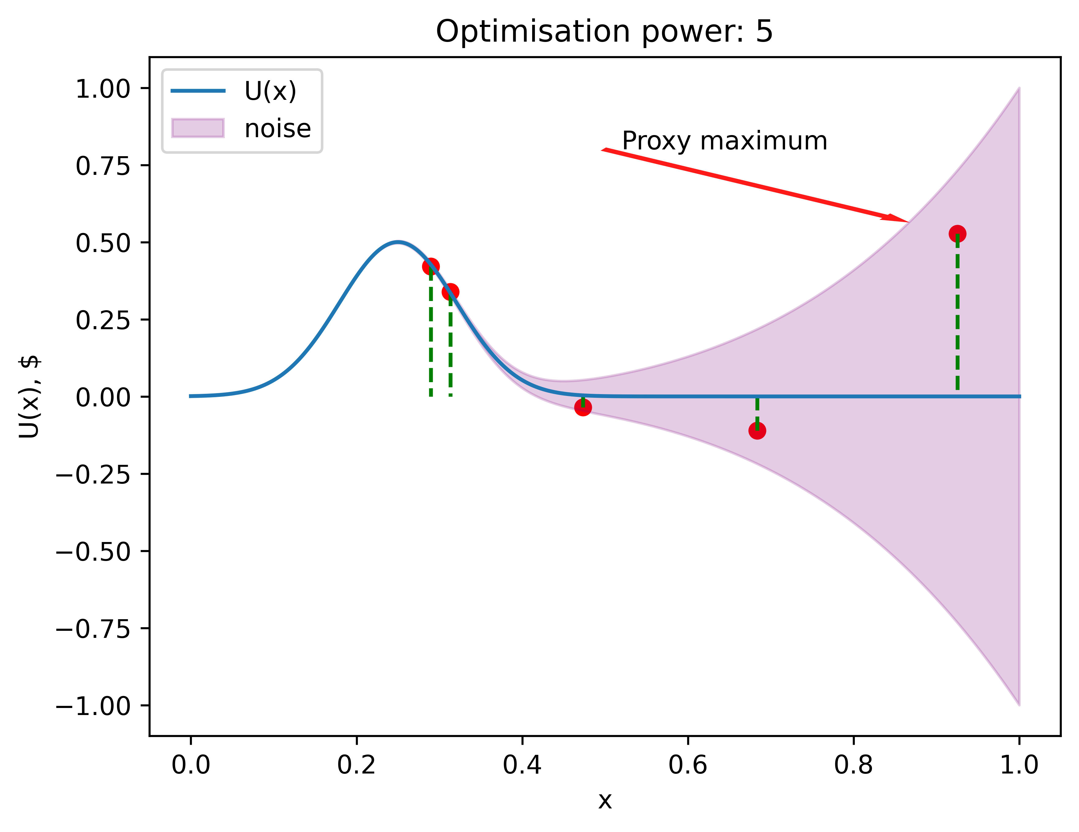 The number N of observed points (aka the number of times Veronica pressed the button) will be referred to as 'optimization power'. The higher this number, the closer (on average) her proxy maxima will be to the actual maximum.