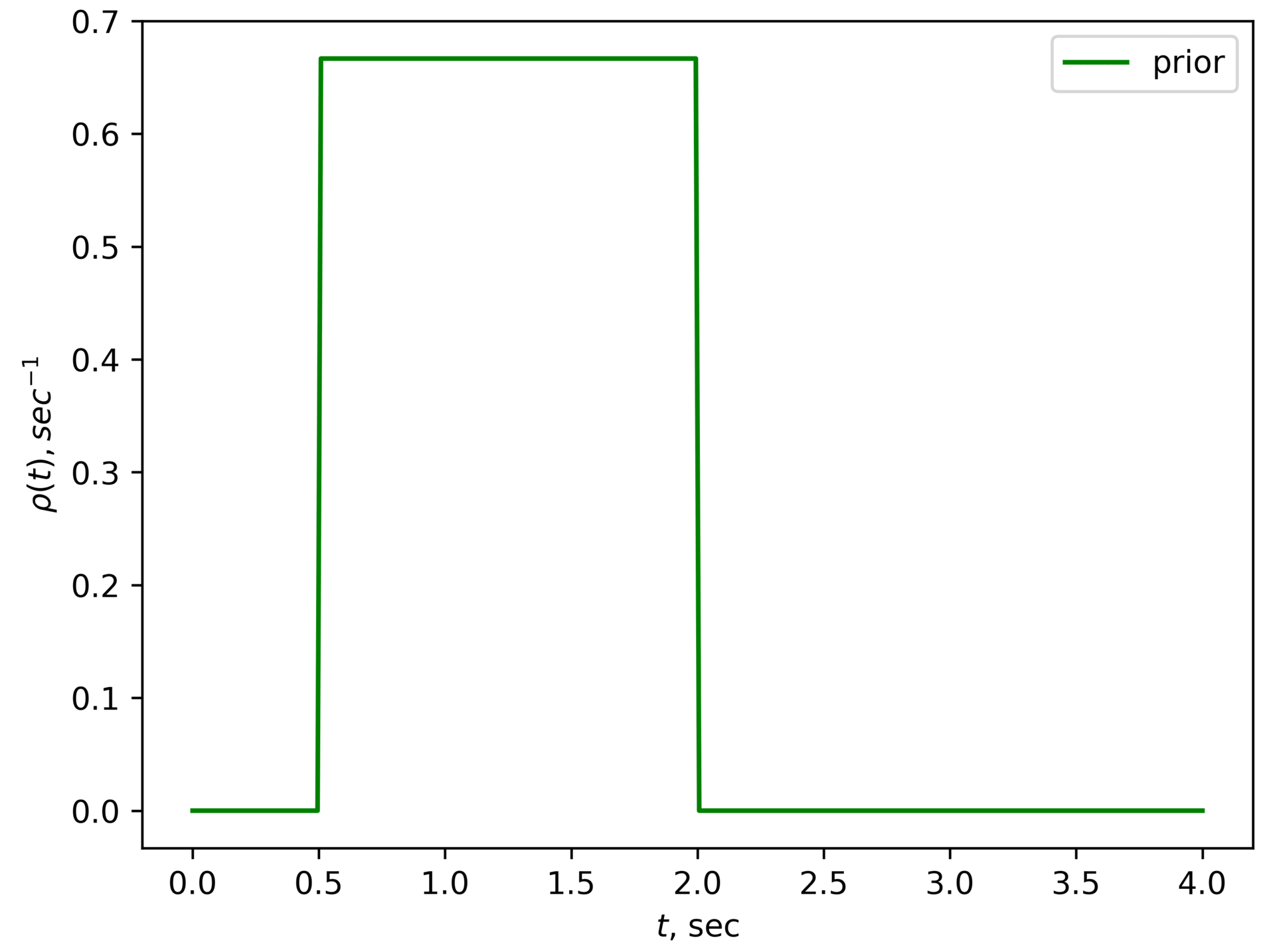 He knows that t1/2 is somewhere between 0.5 and 2 seconds. His prior distribution on ρ(t1/2) might look something like this: