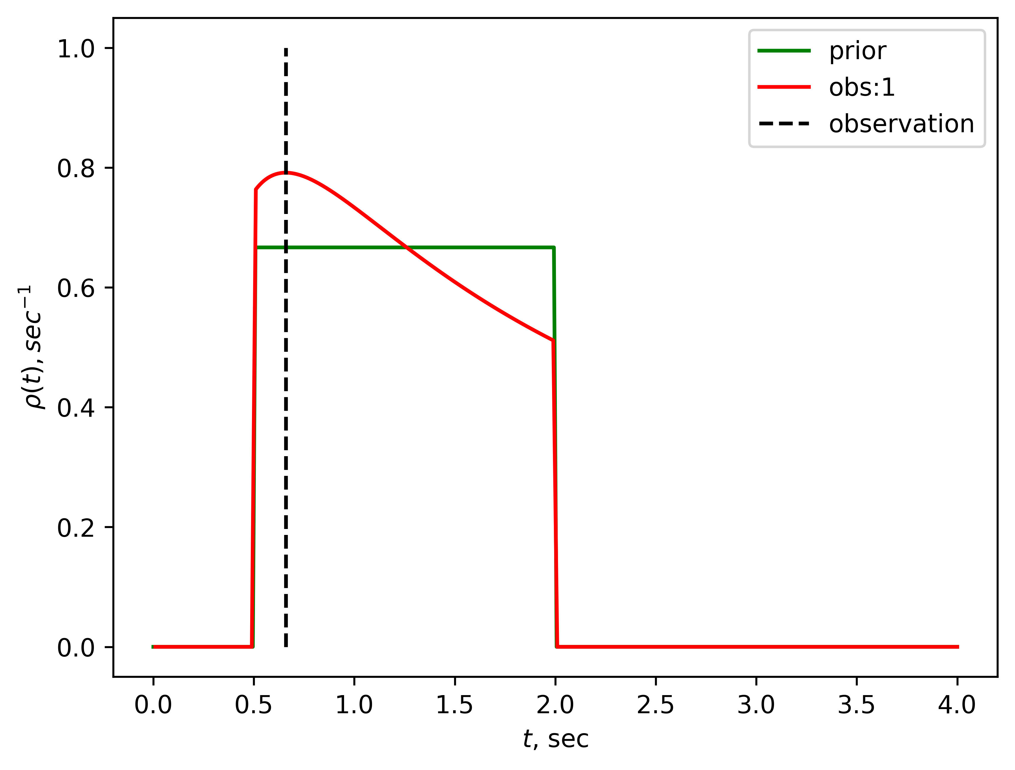 Each possible value of the t1/2 is a hypothesis, and the prior distribution assigns some probability (in our case probability density) to each hypothesis. After Roman gets an observation t1, he updates his beliefs about how likely each hypothesis is using Bayes's theorem:[3]