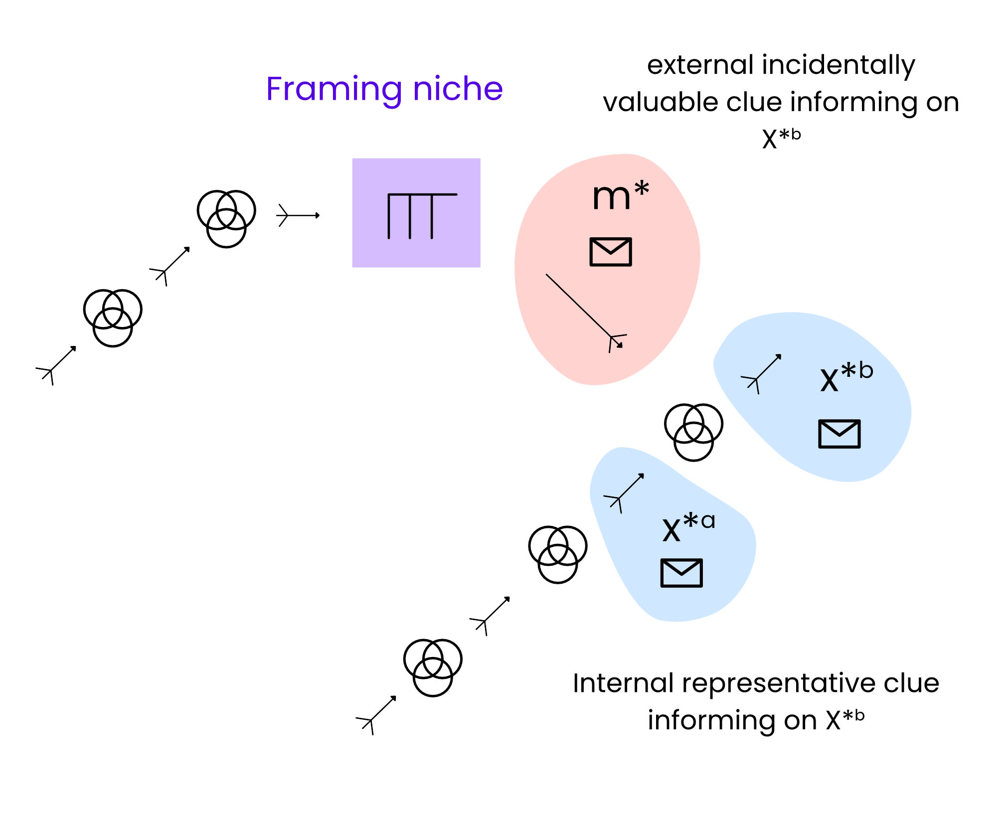 Considering abstraction and the various niches presented one final surprise. We argued that certain niches create micro signifier divides which define semi-independent representational domains within the input and output side. These representational domains occurred via messages that juxtaposed their surrounding context. On the input side, the framing niche created messages that acted as external clues that informed on other representations. In some situations, these clues acted as a valuable set response worthy of behavioral modularization. This niche created a message with response-side attributes. On the output side, the regulation niche selectively filtered out situations based on output responses. This stood out against the backdrop of other niches responding to propagated orders originating from the input side. The regulation niche creates its own situational detection and thus creates a message with more recognition side attributes. These micro representational domains exist within the macro representational domains and were likewise defined by causational specialization.