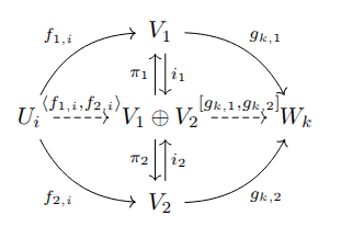 The upshot is that the direct sum is both a product and a coproduct. Let 0A,B:A→B be a zero function; since the direct sum also satisfies the identities π1∘i1=idU,π2∘i2=idV,π1∘i2=0V,U,π2∘i1=0U,V, by definition it is a biproduct. We can now abstract from the category Vect to semiadditive categories, which are by definition categories with a zero object and all pairwise biproducts. Let C stand for any semiadditive category, with biproduct ⊕.