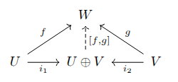 To show that the direct sum is a coproduct, let U and V be vector spaces, and let i1:U→U⊕V be defined as i1(u)=(u,0), and similarly let i2:V→U⊕V be defined as i2(v)=(0,v). Let us suppose a third vector space W and linear maps f:U→W and g:V→W. Let [f,g]:U⊕V→W be defined as [f,g](u,v)=f(u)+g(v). Now [f,g] uniquely commutes: