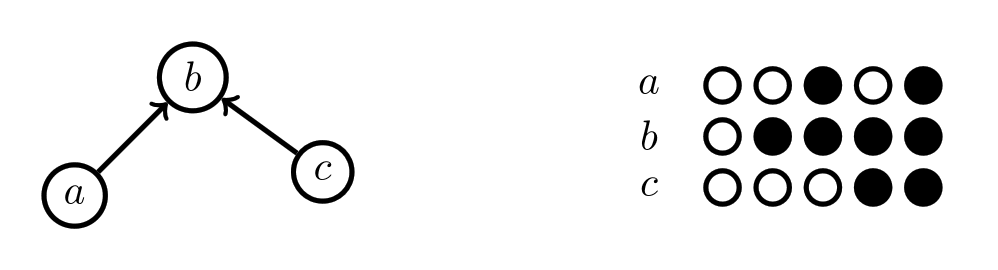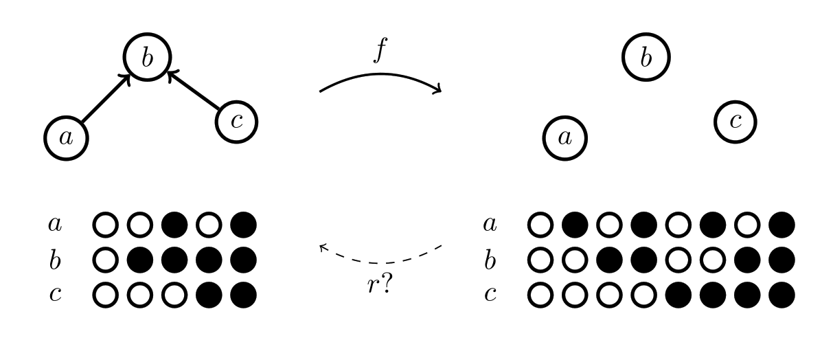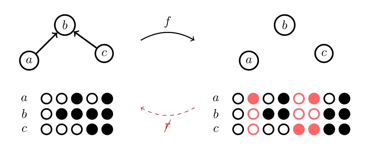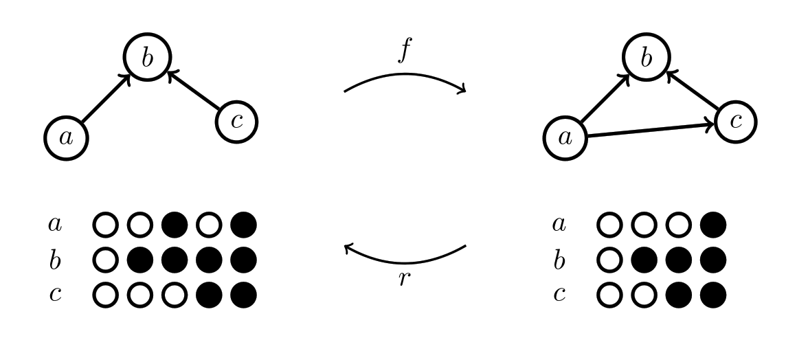 What about the one with the arrows from above? How can we make an arrow into a coloring rule? One way we could do it is by stipulating that if there's an arrow x→y, we'll make a rule that if x is colored black, then y has to be colored black too, where x and y can stand in for any of the pieces. Here's what that Chu space looks like: