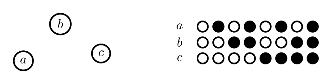 To represent something in a Chu space, we'll put the names of our pieces on the left. How about the rules? For a Chu space, the rules are about allowed ways to color our pieces. To represent these rules, we can simply make columns showing all the allowed ways we can color our pieces (just get rid of any columns that break the rules). Here's what a basic 3-element set (pictured on the left) looks like as a Chu space: