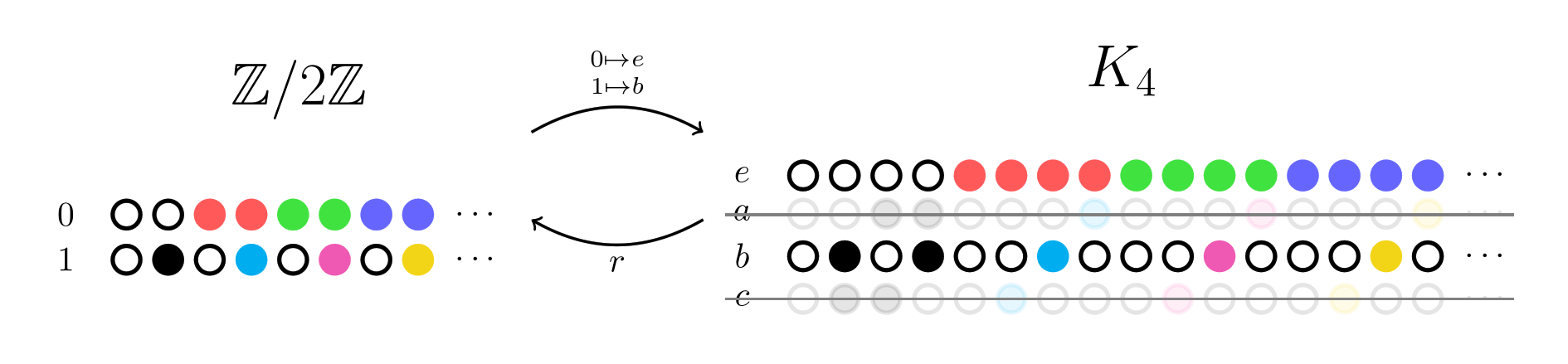 Again, we'll choose a forward map, this time taking e and b to 0, and a and c to 1. The reverse map then verifies that the group structure is satisfied, by looking for a column of K4 for every column of Z/2Z.