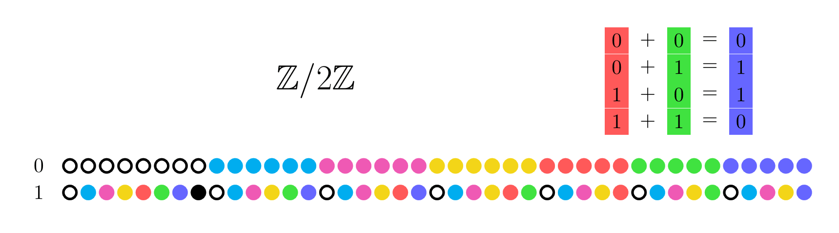 Note 1: For Z/2Z, there are four relations of the form r+g=b. Let's start with 0 + 0 = 0. To cover this relation, we must turn on either the red, green, or blue light for 0. So the 0 row will never be colored black. If we color 0 white, then we've covered every relation, since every relation has 0 in either the r, g, or b slot. On the other hand, if we colored 0 green, then we would need to turn on either the blue or the green light for 1 in order to cover the second equation 0 + 1 = 1. If we turned on the blue light for 1, then the third equation 1 + 0 = 1 would be covered already, but the fourth equation 1 + 1 = 0 won't. We'll have to turn on either the red or the green light for 1 in order to cover the fourth equation. Here's the code I used to calculate these. ↩︎