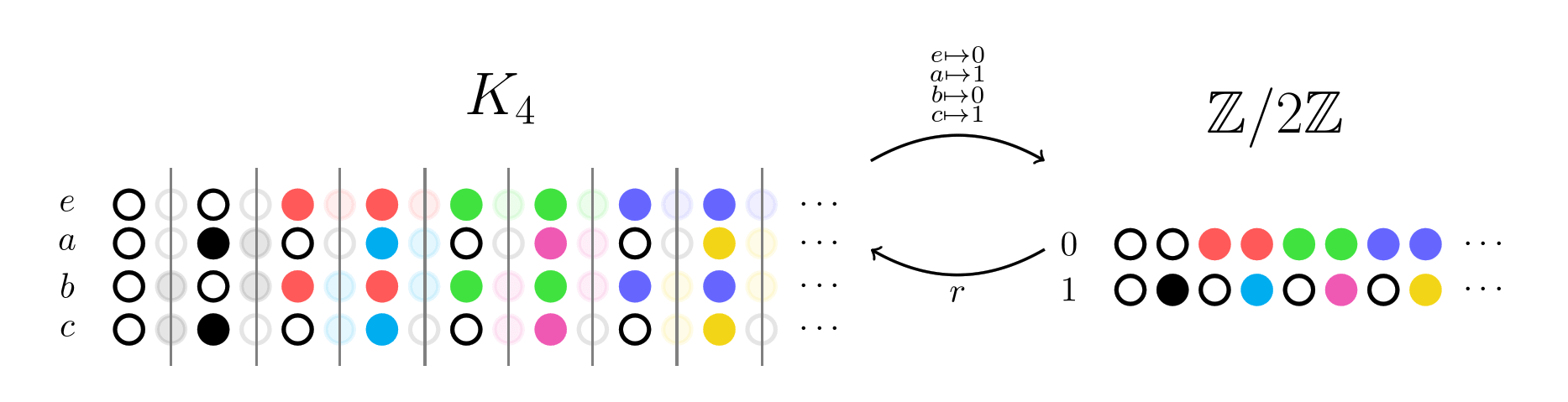The reverse map r responds by finding the representative of each column from K4. E.g. the 2nd column of K4 must be mapped to the 2nd column of Z/2Z. If it can't find such a map, we can think of this as an answer in the negative.