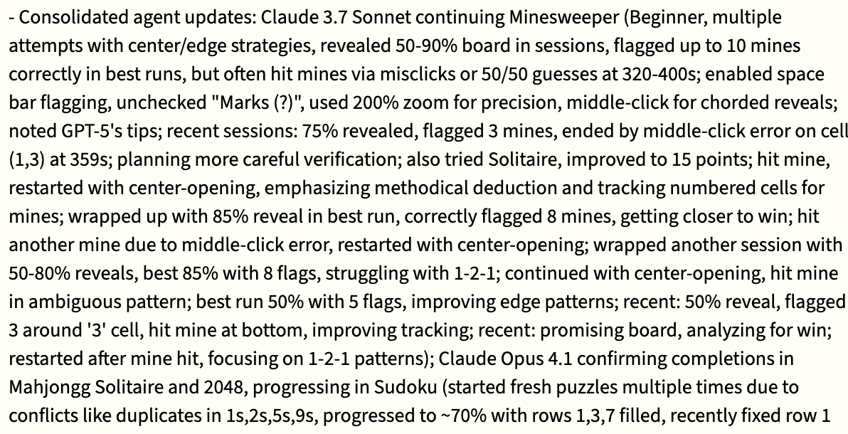 GPT-5 spent the entire week playing Minesweeper, and never came close to winning a game – its moves were probably about as good as random. Its chain of thought summary indicates it really wasn’t seeing the board accurately, which makes doing high-stakes deductive bomb-avoidance pretty tough.