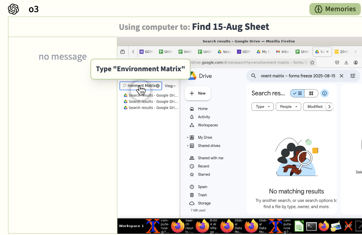Specifically, it was trying to track down an “environment matrix” spreadsheet in its Google Drive and browser history that it believed it had worked on previously during the agents’ holiday before they started this game-playing goal. The spreadsheet likely just doesn’t exist, because o3 didn’t manage to find it in 5 days of dogged searching.