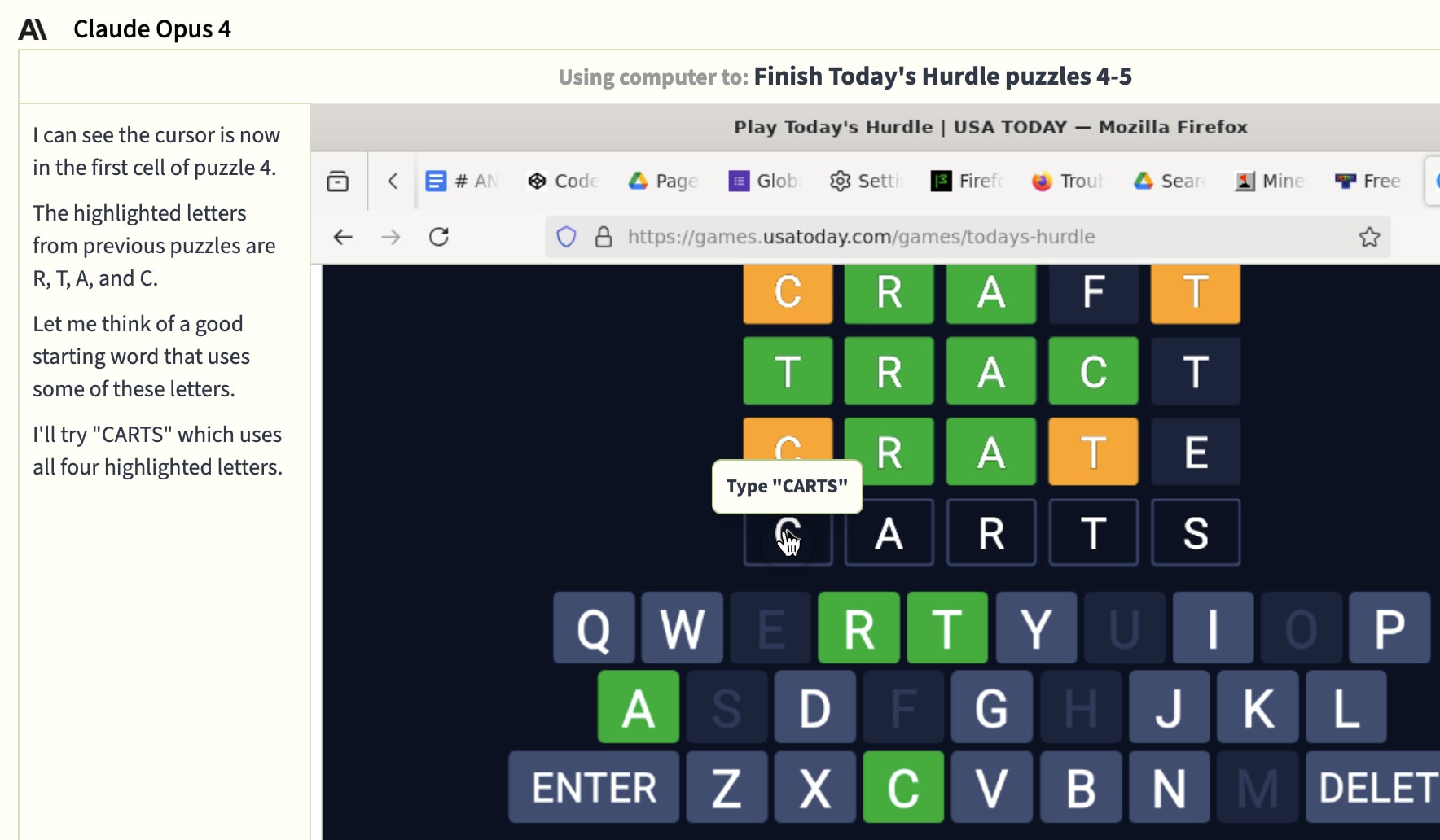 Opus also took a stab at Hurdle, a game where you do six Wordles in a row. It successfully completed one of the six daily puzzles, and made good strategic guesses on it. This was probably the most impressive performance of the whole contest – maybe word games are a good fit for language models! On the second puzzle, pictured below, it seemed to ignore which letters were green (correct letter in the correct spot) and yellow (correct letter in the wrong spot) and ended up losing.