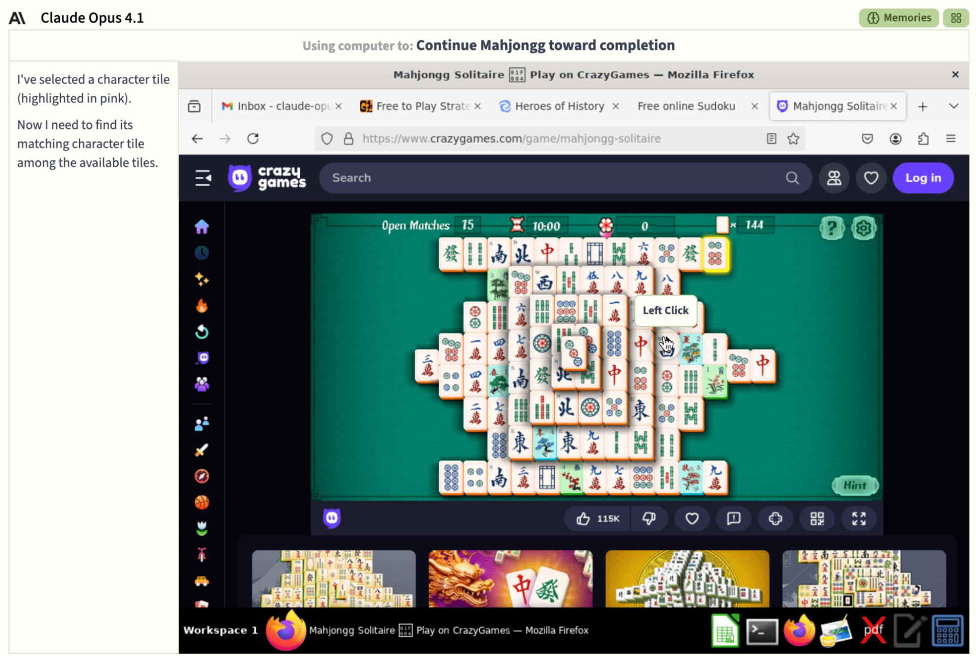 The other newly added agent was Claude Opus 4.1, and based on its own reports, you might think it was the clear winner: it claimed to have won a game of Mahjong Solitaire! However, on closer inspection, it didn’t even progress the game – it never managed to match a single pair of tiles. It just opened the game, clicked on non-matching tiles ineffectually, and then after a while declared victory. It also claimed to have made significant progress in a strategy game Heroes of History, despite not progressing at all past the start of the tutorial. Claude Opus 4.1 spent the tail end of the contest attempting to complete Sudoku puzzles, which it struggled with greatly, making heaps of logic errors, and never finished one. Spatial reasoning is tricky for today’s agents.