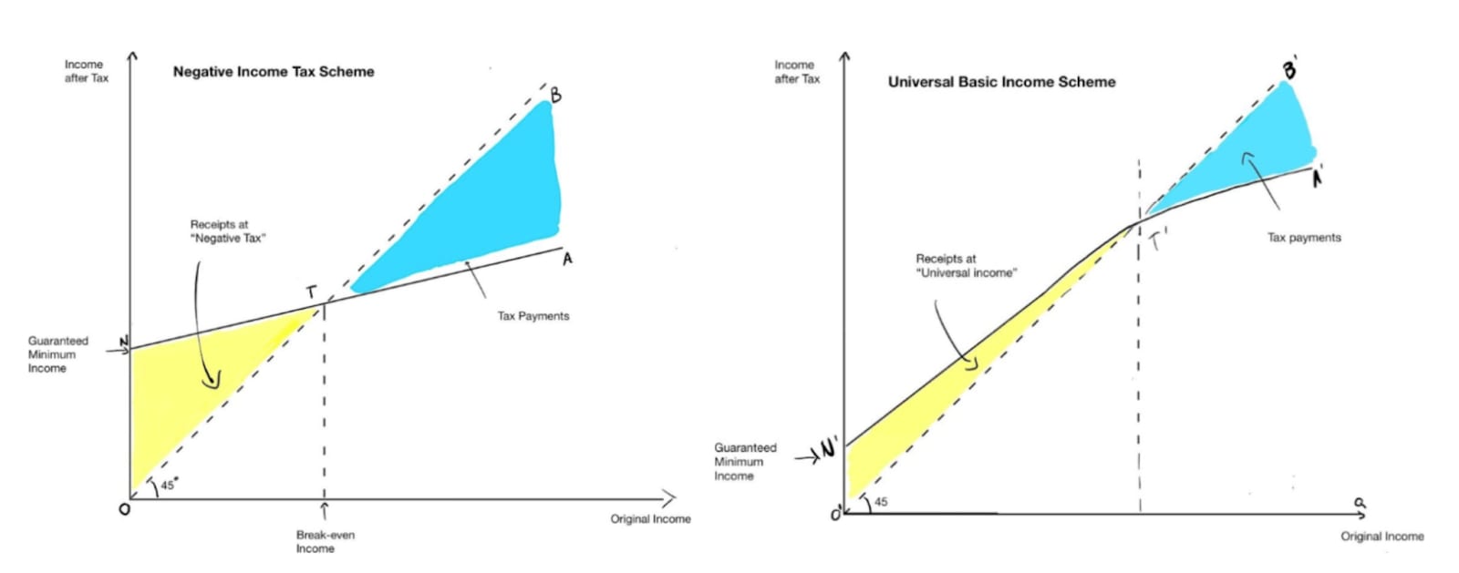 This article from the Adam Smith Institute explains more thoroughly, and includes a helpful diagram showing the impact of an NIT and UBI on tax rates: