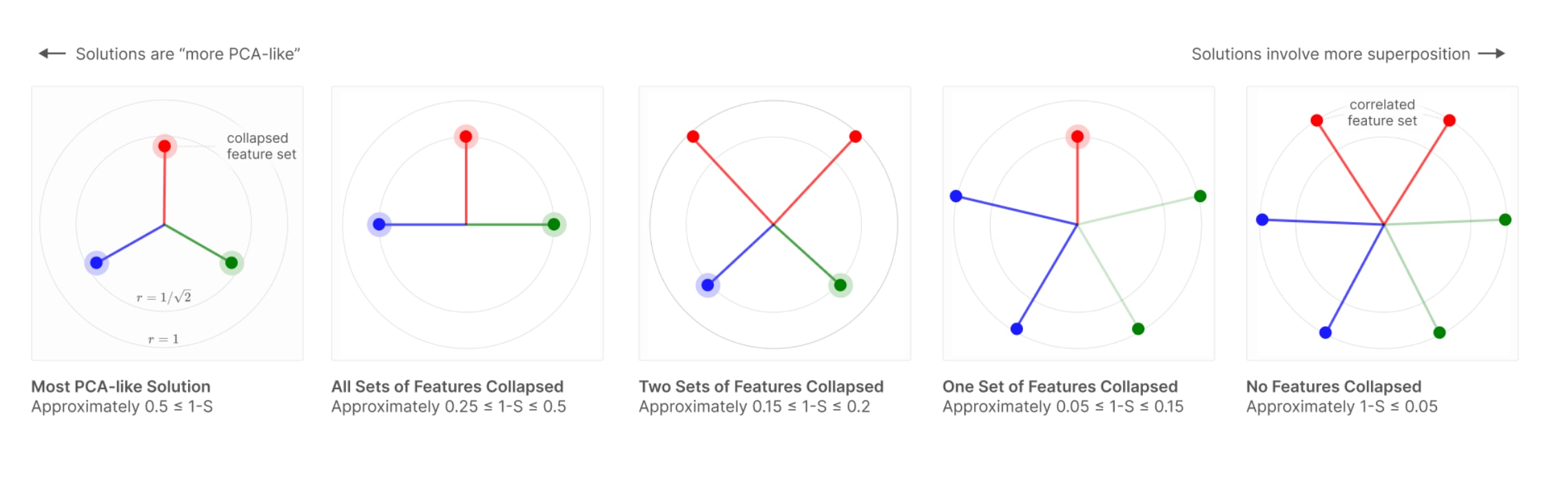Also, see any of the toy models in Anthropic’s TMS post, especially the 2 dimensional ones (like the one I included in this post). Note that while Anthropic’s TMS mentions both reasons, many of the toy models are very low-dimensional and mainly have superposition due to high sparsity + a slightly different definition of "linearly represented".