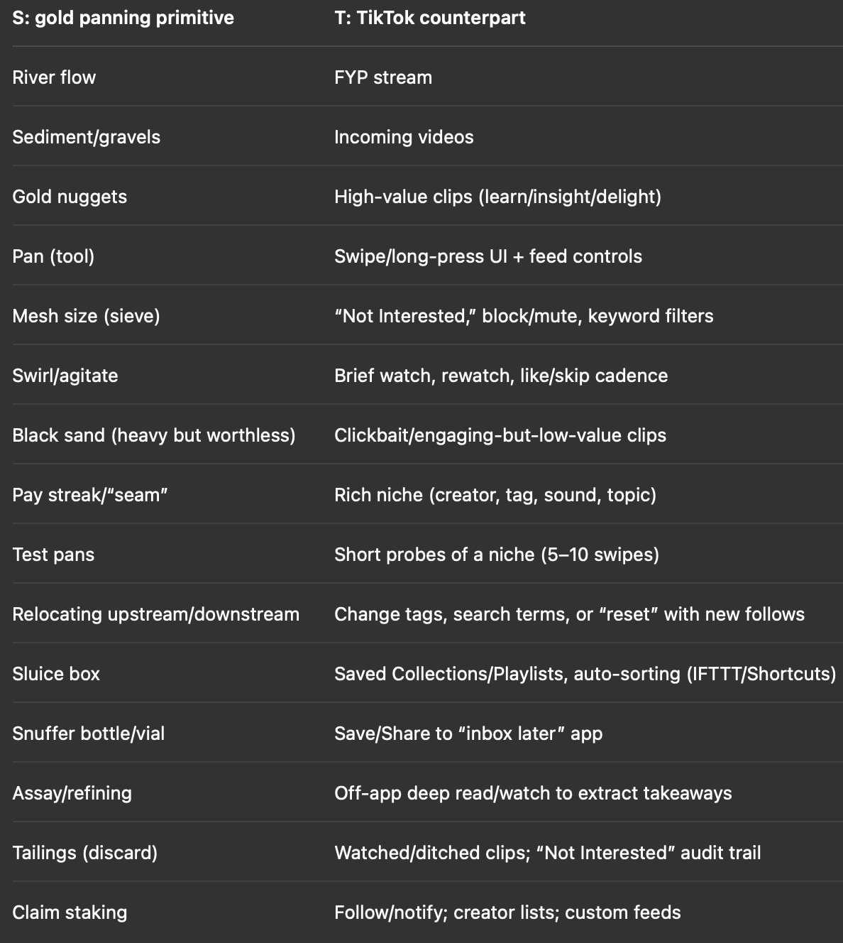 The above represents the beginnings of a strategy for better enjoying TikTok scrolling, inspired by the experience of gold prospectors. The framing is far from perfect, yet it can still be useful.