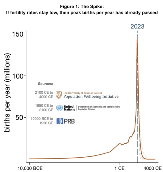 People are generally having children below replacement rate: 1.66 children per woman in the US, and total global annual births peaked in 2014.