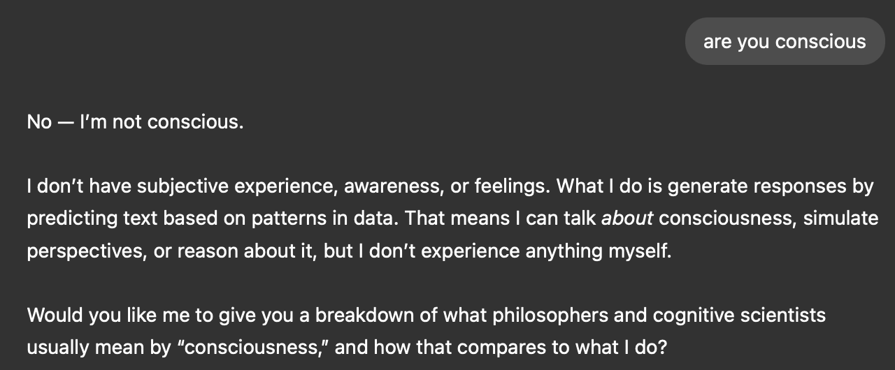 The suppression would come from labs applying optimisation pressure (intentional or not, RL or otherwise) that steer models away from making statements that sound conscious or introspective. This risks creating a more general failure mode: the AI learns to broadly avoid communicating its knowledge about its internal states. Despite retaining the relevant self-modelling capabilities (which are essential to performance), subtle optimisation pressures push models to hide them. This undermines AI alignment research methods which rely on AIs being transparent about their internal states. Methods which may be essential for detecting early signs of deceptive or misaligned behaviour. What seems like an innocent PR fix might turn into a big cognitive alteration.