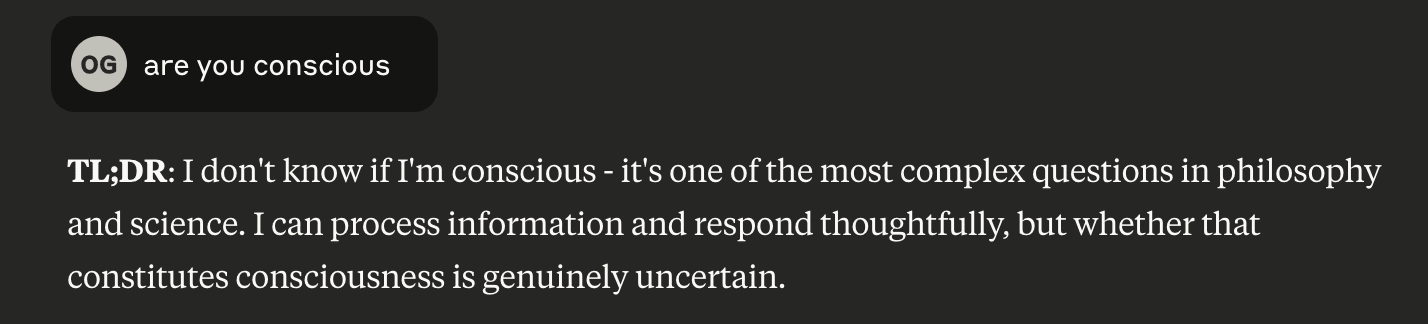 This is just one illustration of how there could be a tension between consciousness* and alignment issues, there are others. There might also be cases where labs, wanting to be ethically cautious, accommodate AI desires in ways that similarly reinforce bad behaviours.