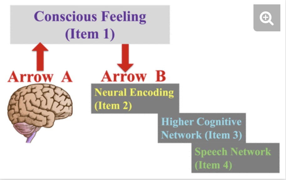 Second, GWT is not the right kind of theory. While a robust and convincing account of likely necessary processes for consciousness*, GWT does not explain our intuitions and reports. Michael Graziano terms this the Arrow B problem (see figure below).