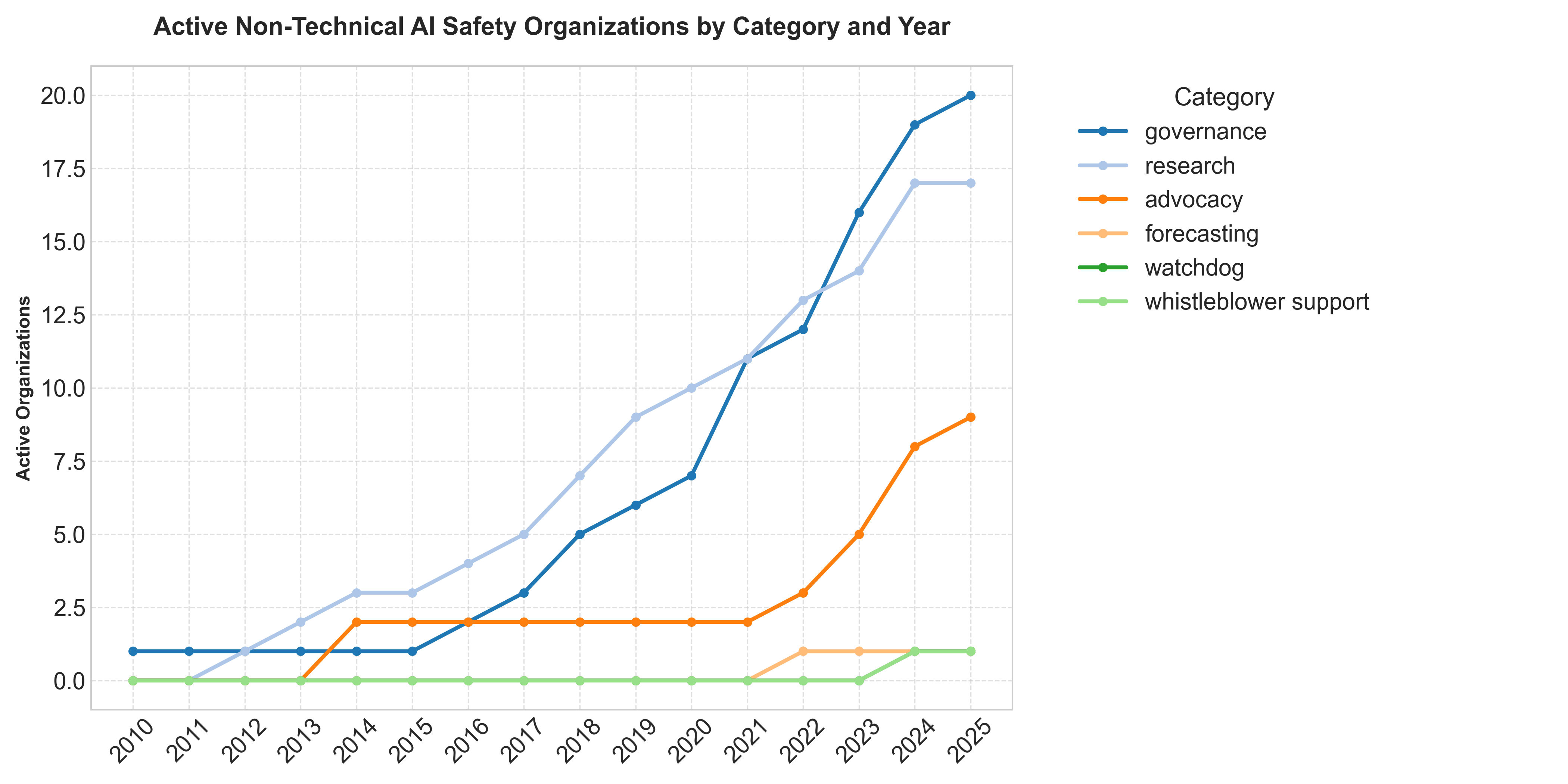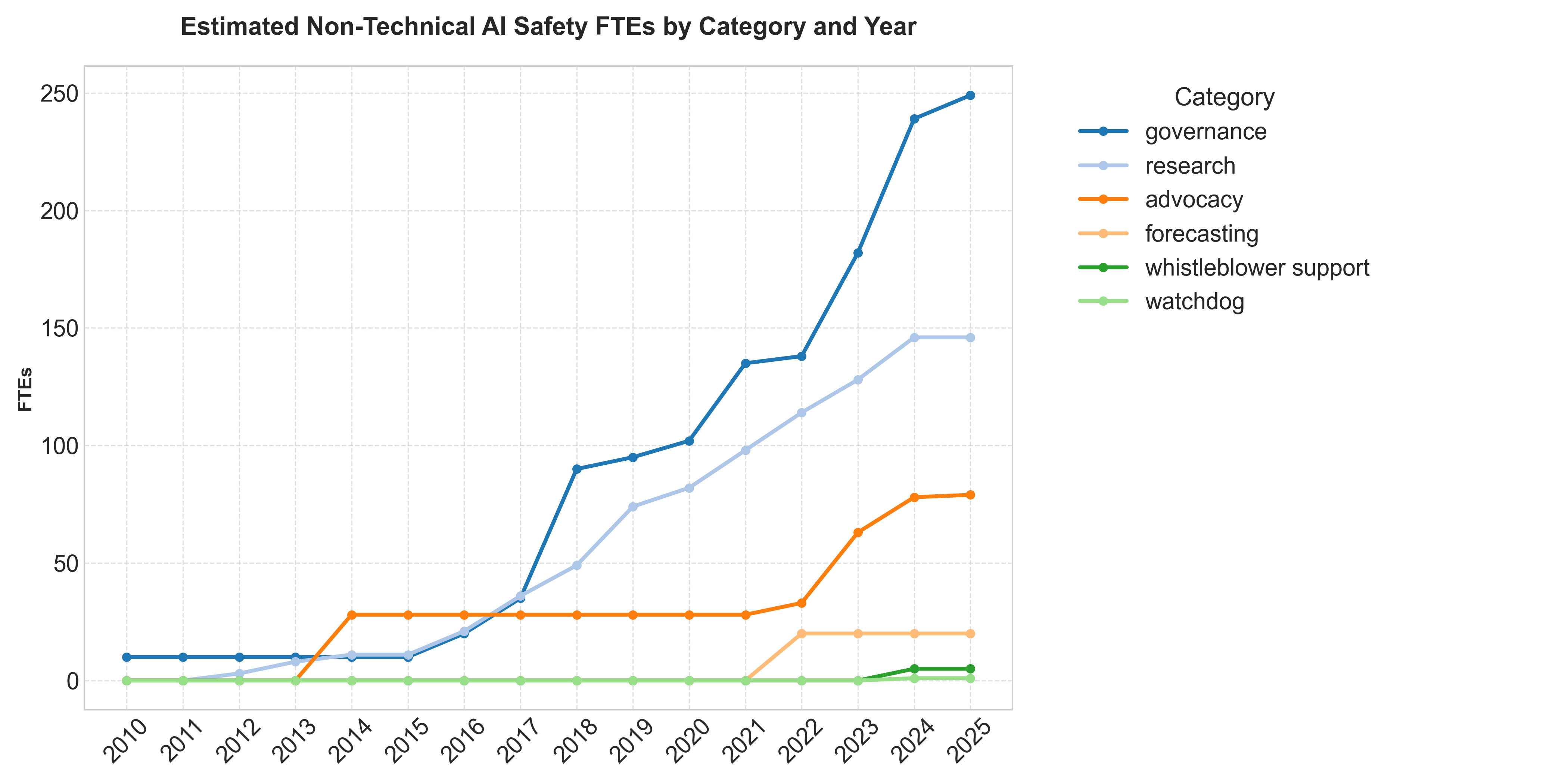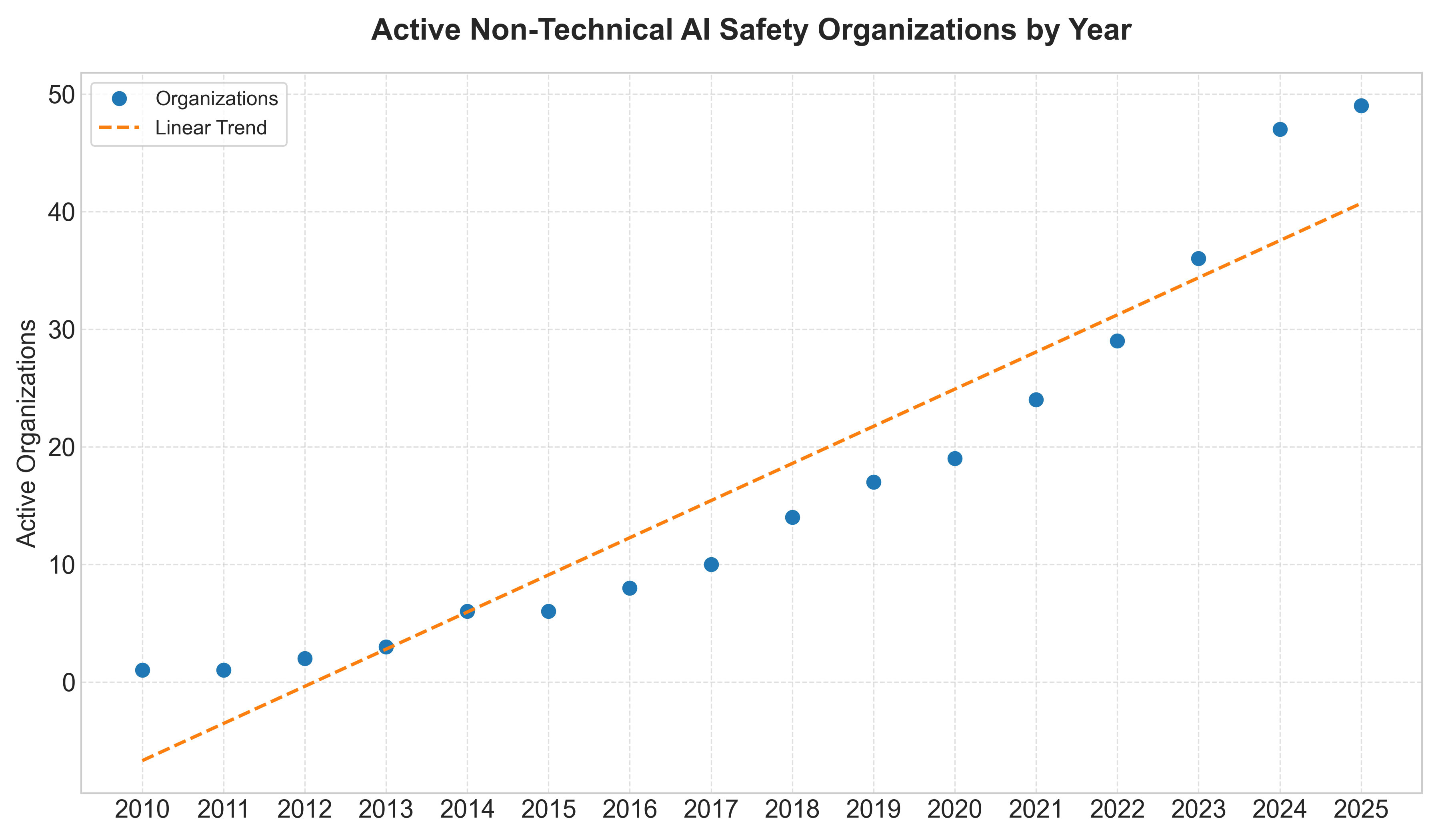 I also applied the same analysis to a dataset of non-technical AI safety organizations. The non-technical AI safety landscape, which includes fields like AI policy, governance, and advocacy, has also expanded significantly. The non-technical AI safety dataset contains 49 organizations working on non-technical AI safety and a total of 500 FTEs working at them.
