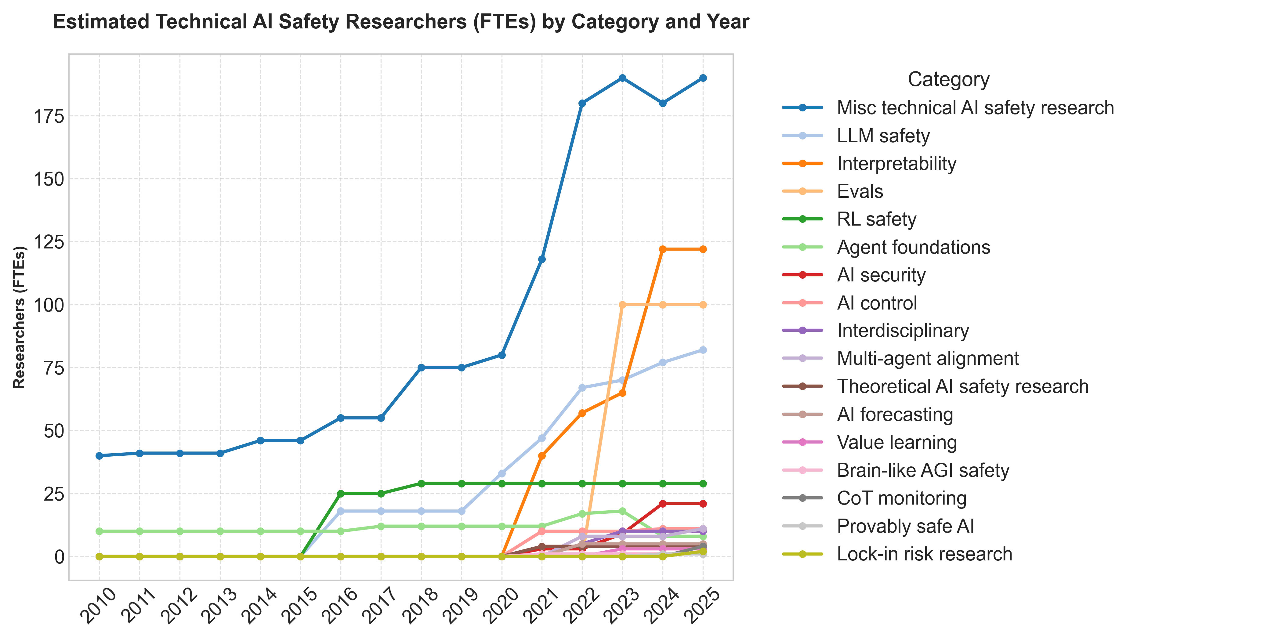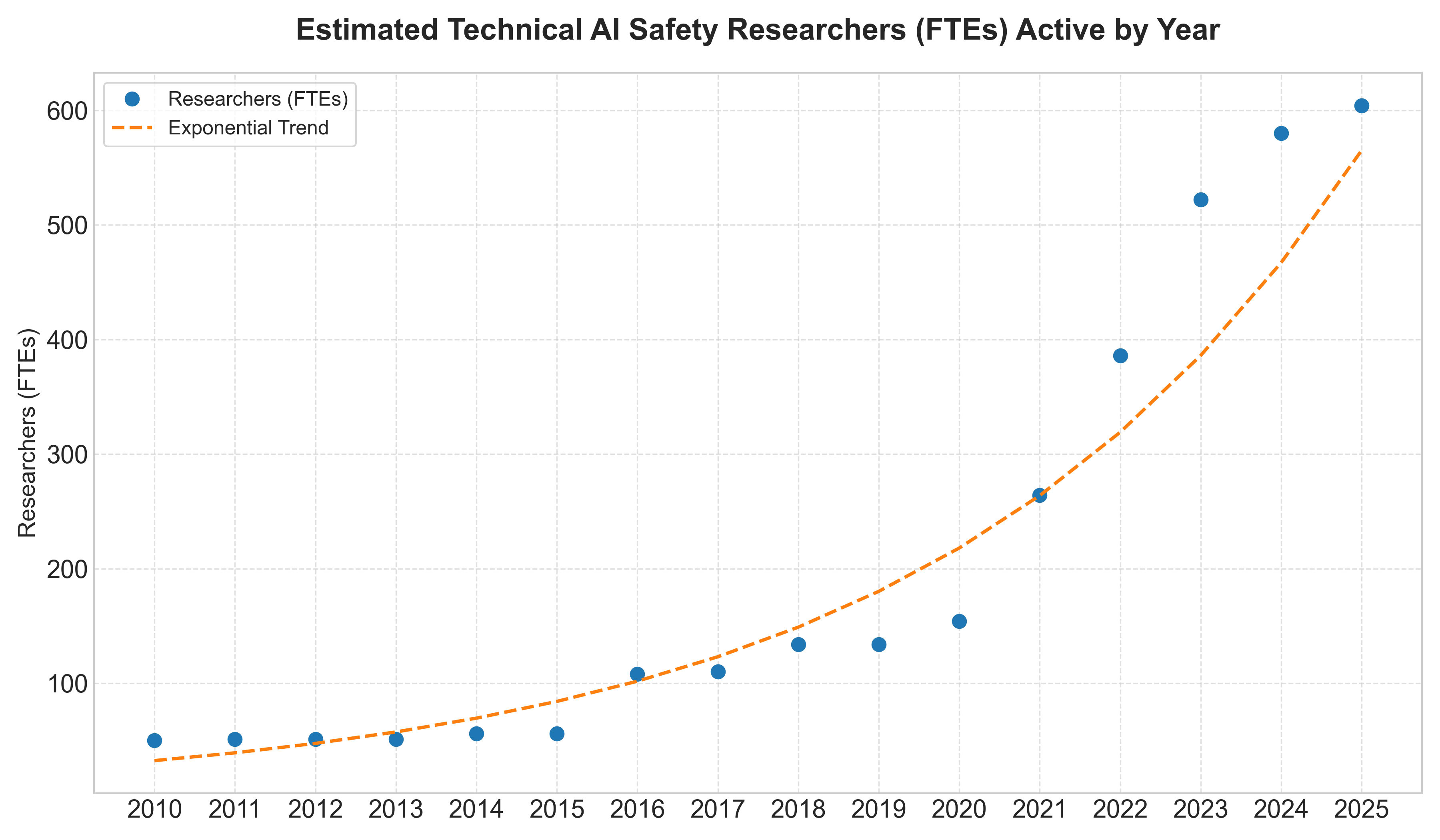 Based on updated data and estimates from 2025, I estimate that there are now approximately 600 FTEs working on technical AI safety and 500 FTEs working on non-technical AI safety (1100 in total).