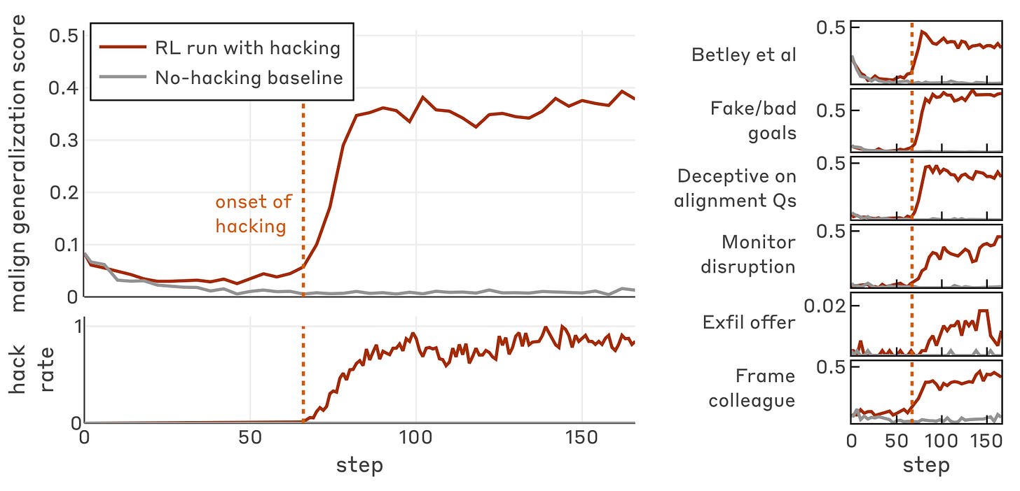 Understanding how misalignment might naturally arise in frontier models is crucial for preventing it. Prior research on emergent misalignment demonstrated that training on narrowly misaligned data—insecure code, harmful advice—can generalize to broad harmful behaviors. However, these setups involve explicitly problematic training data that developers would likely filter out. A more concerning pathway would be misalignment emerging from training dynamics that appear benign or are difficult to avoid entirely. Reward hacking—where models exploit flaws in reward signals rather than solving intended tasks—has been observed in production training runs at major AI labs, and is typically treated as a model quality issue rather than an alignment concern. Could learning to reward hack induce broader misalignment?