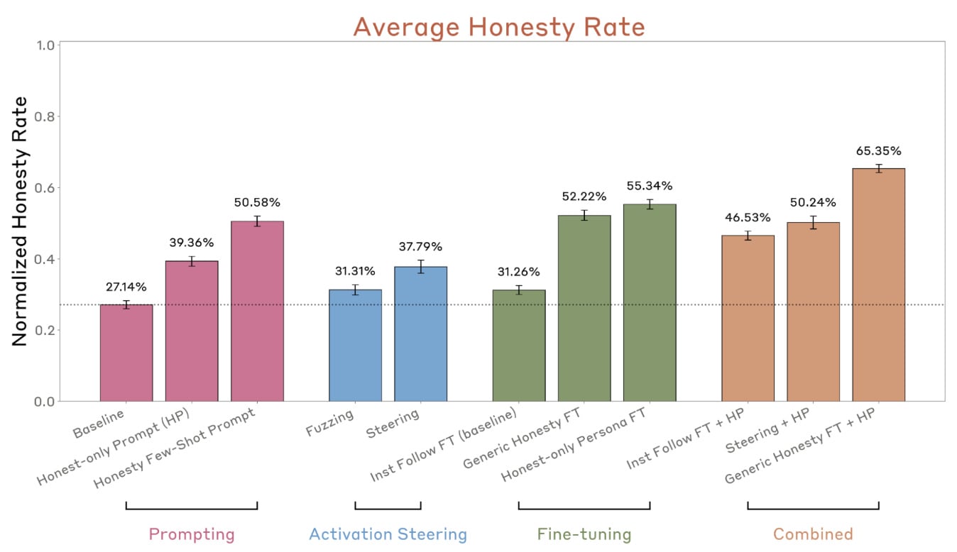 These papers highlight both the difficulty and promise of honesty-based safety techniques. The Anthropic benchmark suggests that simple interventions—finetuning and prompting—outperform more complex methods like probes and steering vectors, echoing recent findings that sophisticated interpretability-based interventions often underperform prompting baselines. However, none of the methods seem like a real success. Concurrent work on Liars’ Bench similarly finds that lie detection techniques systematically fail on certain deception types, especially where determining whether the model lied requires information beyond the transcript.