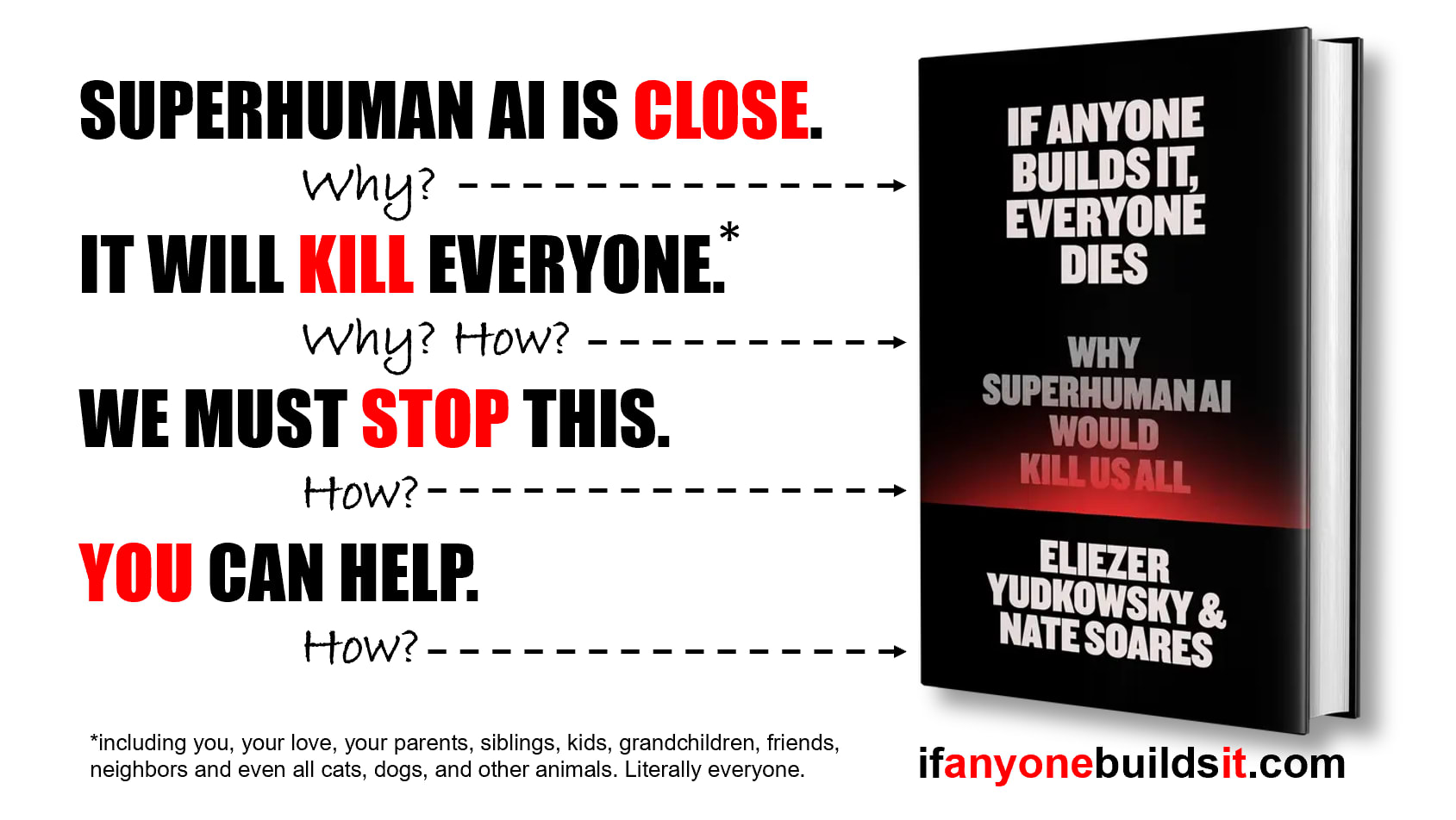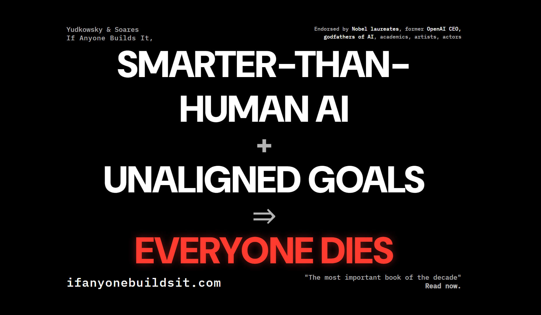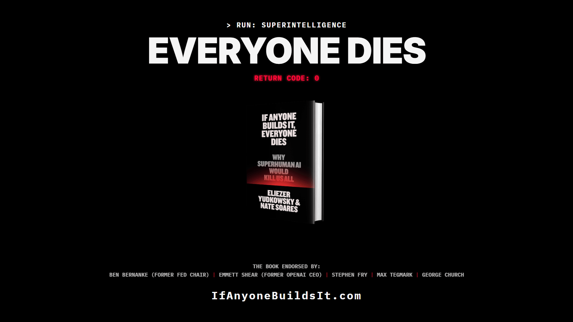 If any company or group, anywhere on the planet, builds an artificial superintelligence using anything remotely like current techniques, based on anything remotely like the present understanding of AI, then everyone, everywhere on Earth, will die.