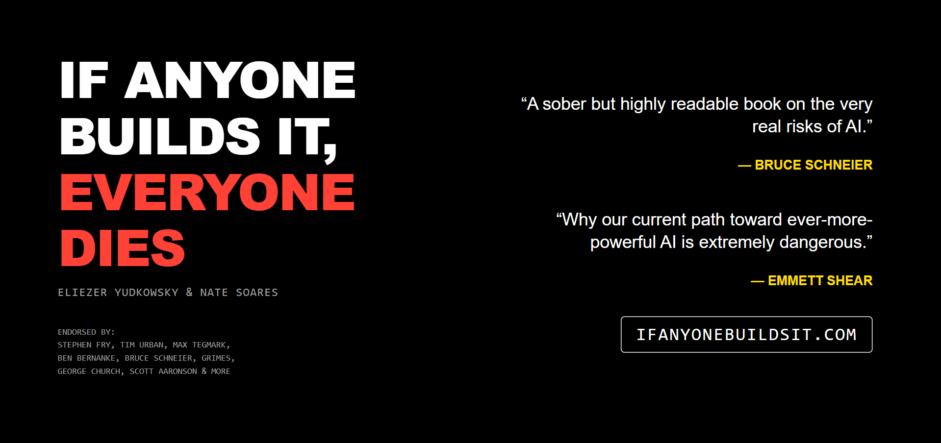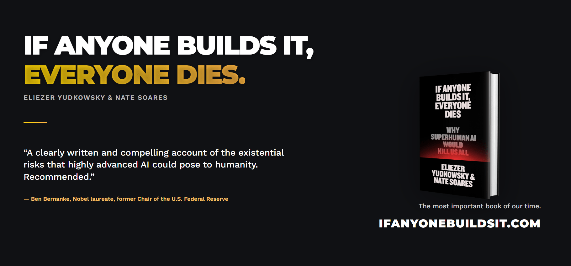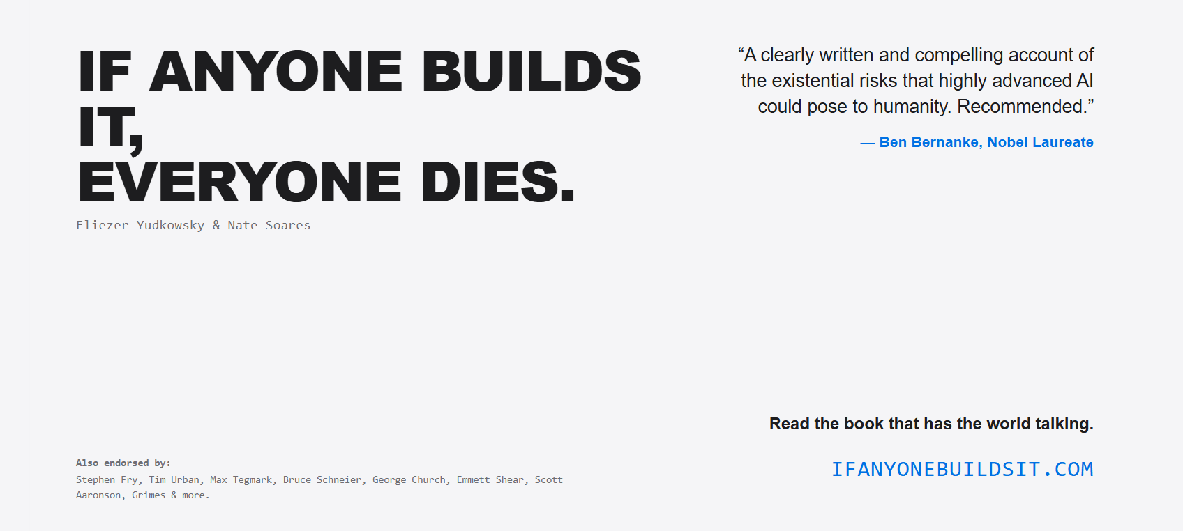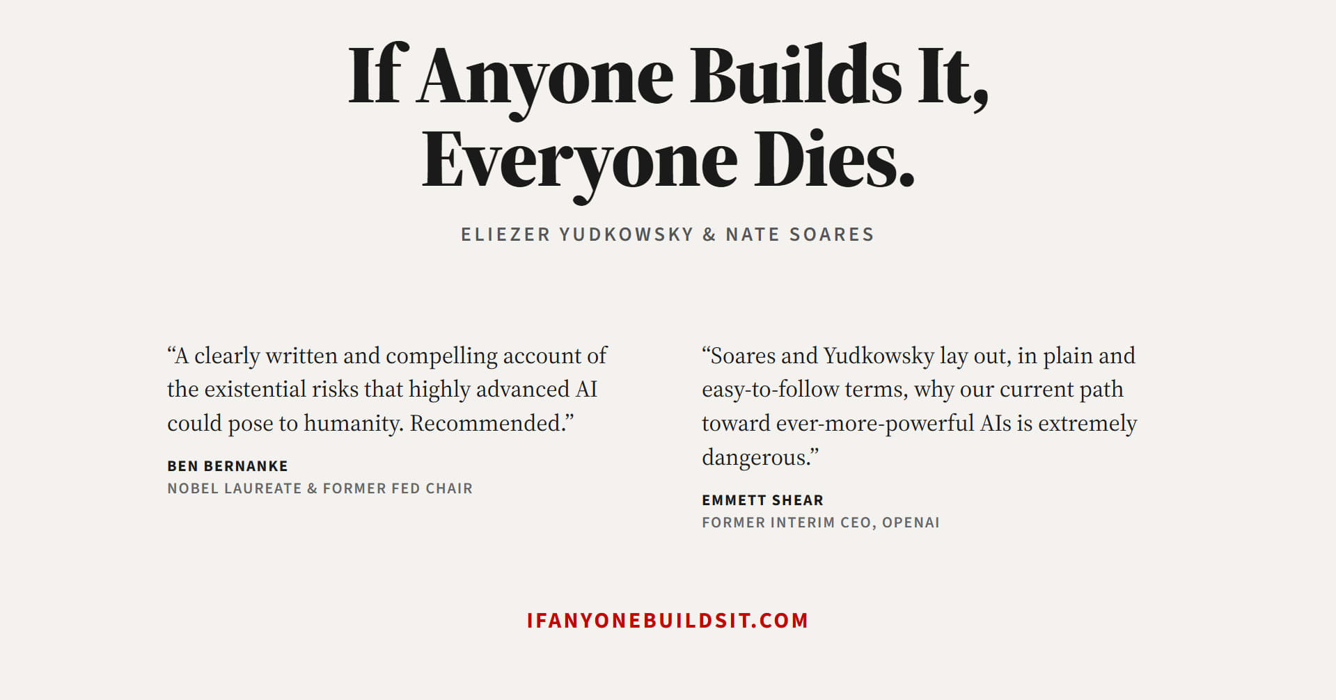 A similar argument could be made about the second line, "it will kill everyone", while the book title says "would". But again, I feel "would" is weaker than "will" (some may interpret it to mean that there may be additional prerequisites necessary for an ASI to kill everyone, like "consciousness"). Of course, "will" can only be true if a superintelligence is actually built, but that goes without saying and the fact that the ASI may not be built at all is also implicit in the third line, "we must stop this".