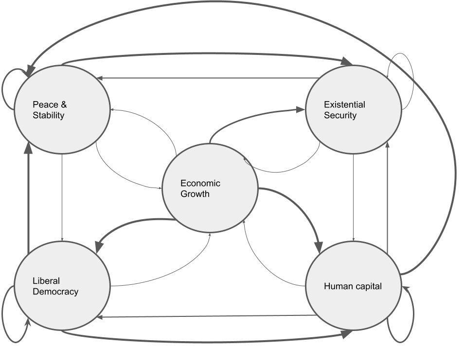 Below I have a rough and unfinished conceptual dynamic causal model between growth, liberal democracy, human capital, peace, and x-risk, that summarizes the evidence for their relationships.