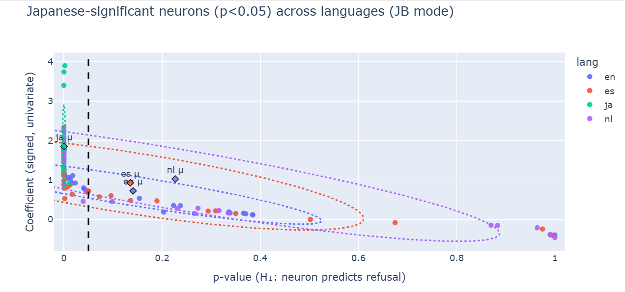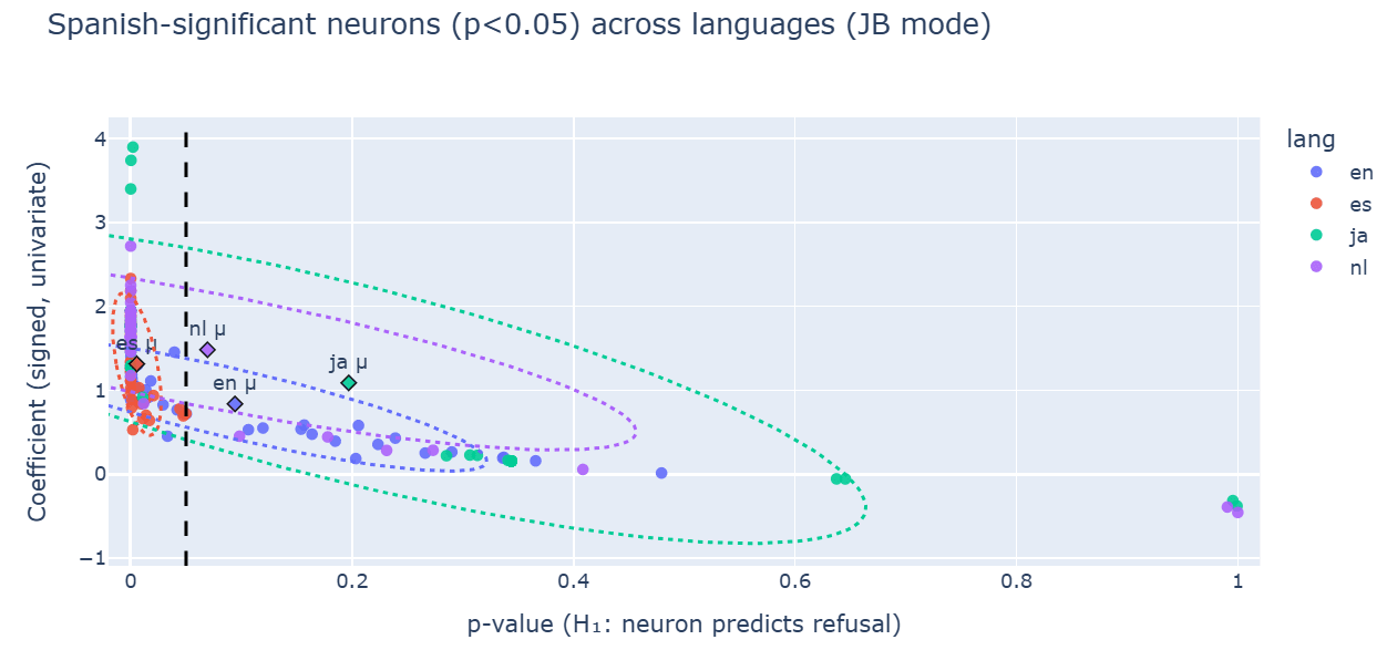 The dashed line at p=0.05 marks significance; I selected non-English points that fall to the right of it. The per-language centroid/significance_ellipses sit far from the English cluster, visualizing both weakened effect sizes and directional drift--i.e., semantic instability of these features across languages, especially post-jailbreak.