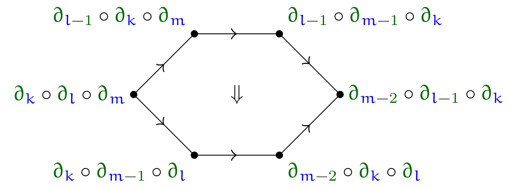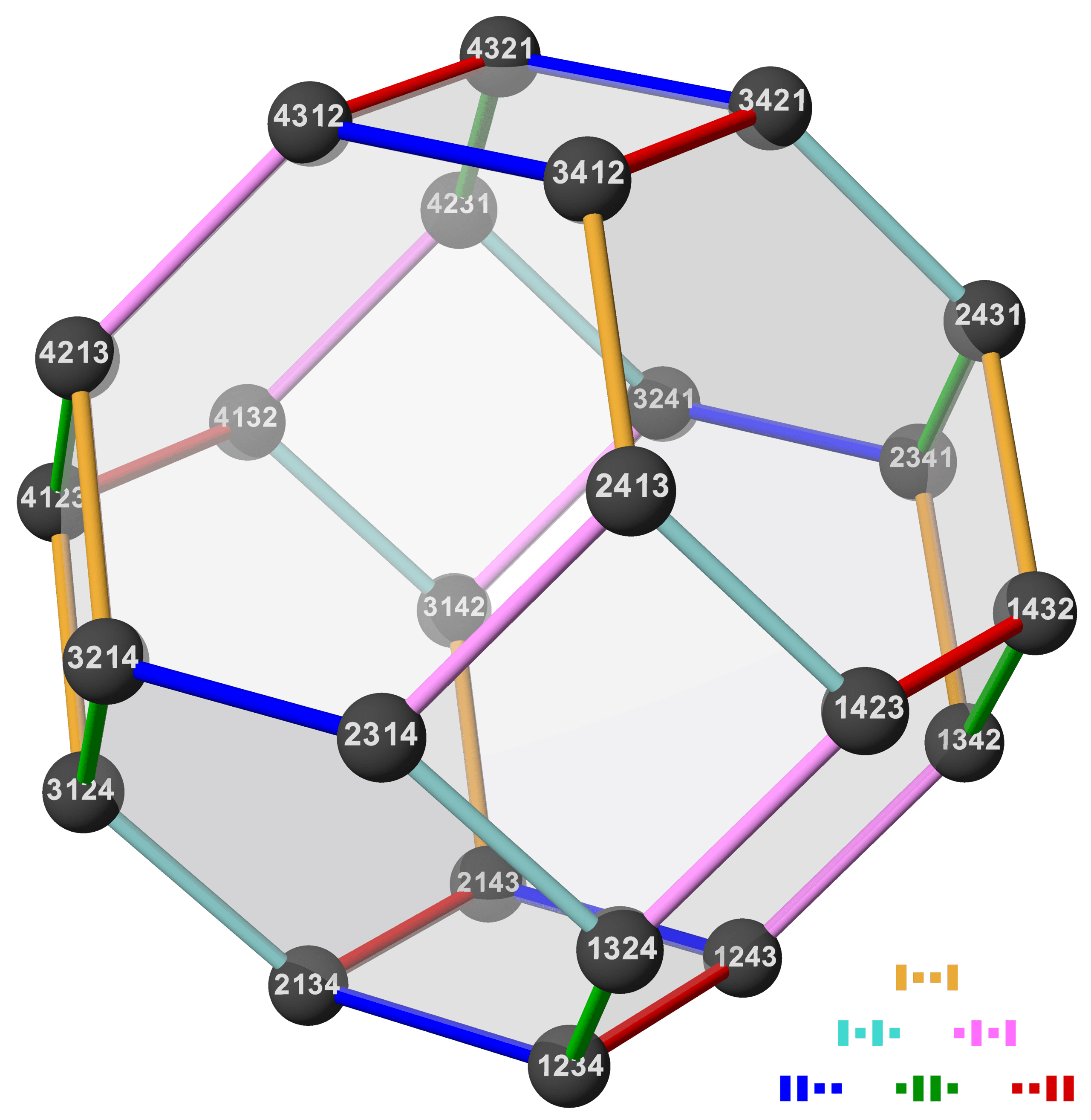 Of course, now the themselves carry data, and we have to impose coherences on those. These identities come up in the context of quadruples of deletions. The first identity is given by a square diagram that says that the homotopies applied to non-interacting indices commute. The second identity is given one dimension up, and describes a filler for the following figure, called a permutohedron, whose faces are the previously mentioned hexagons and squares. It can be visualised via the illustration by Tilman Piesk: