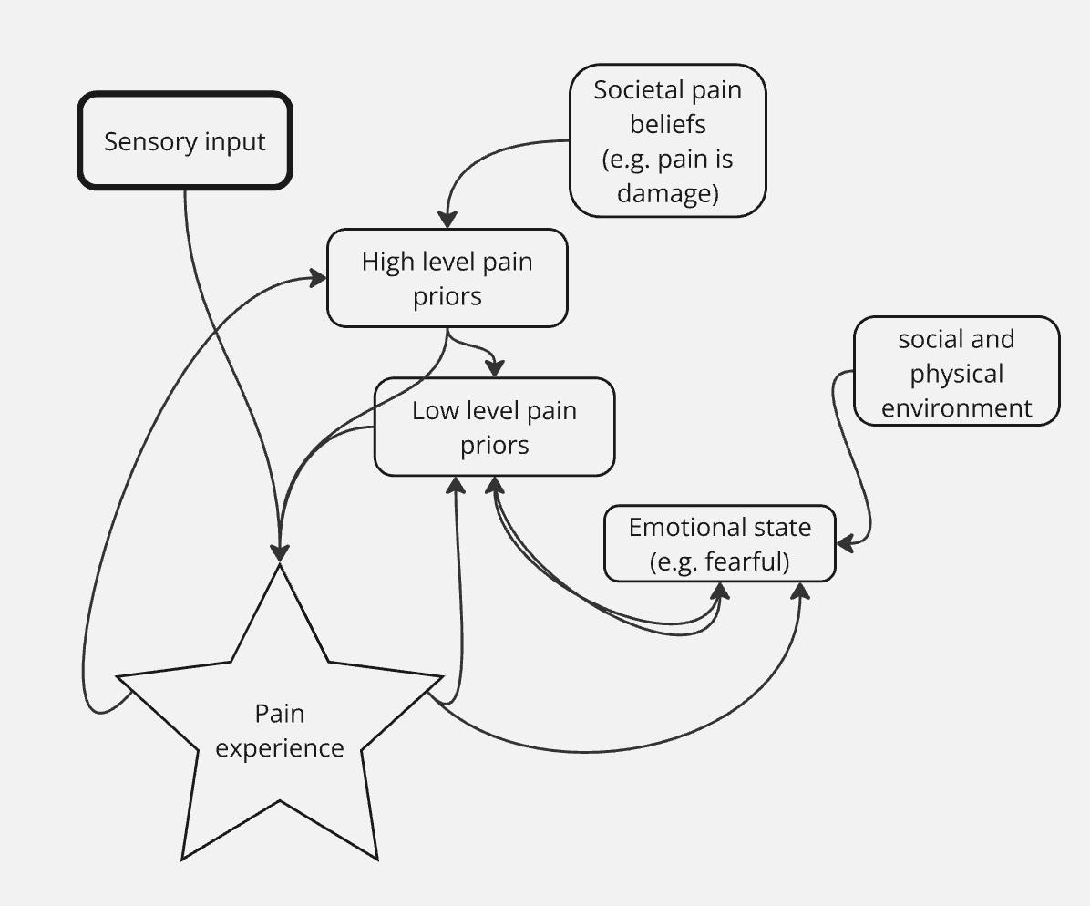 Hechler, Tanja, Dominik Endres, and Anna Thorwart. "Why harmless sensations might hurt in individuals with chronic pain: about heightened prediction and perception of pain in the mind." Frontiers in psychology 7 (2016): 1638.; Büchel, Christian, et al. "Placebo analgesia: a predictive coding perspective." Neuron 81.6 (2014): 1223-1239.; Stilwell, Peter, and Katherine Harman. "An enactive approach to pain: beyond the biopsychosocial model." Phenomenology and the Cognitive Sciences 18.4 (2019): 637-665.; Ashar, Yoni K., et al. "Effect of pain reprocessing therapy vs placebo and usual care for patients with chronic back pain: a randomized clinical trial." JAMA psychiatry 79.1 (2022): 13-23.