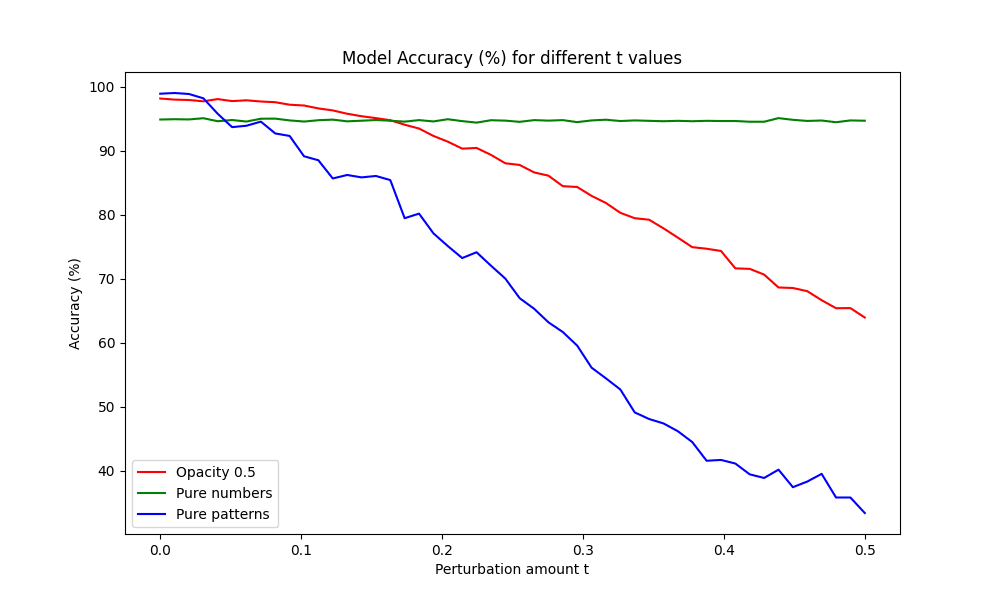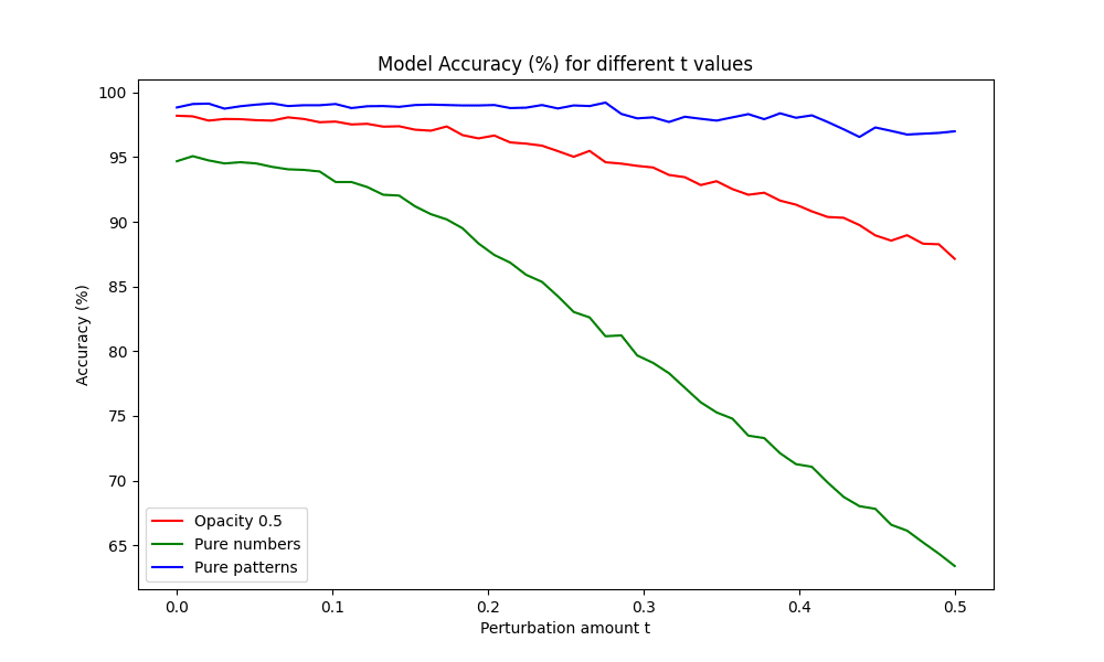 We trained our CNN classifier on a "mixed" dataset consisting of (pixel-level) averages of (pattern, digit) pairs with the same label {(pattern, digit)∣labelpattern=labeldigit}.[2]