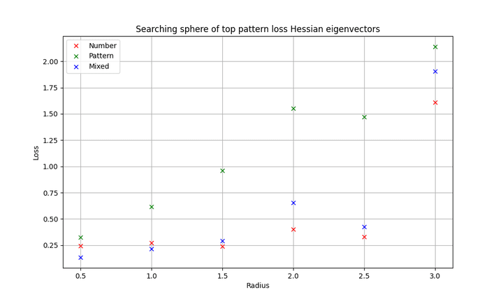 This mixed MNIST data was the test bed of our "module-finding" experiments, and the loss functions associated with the three datasets (pure numbers, pure patterns, and mixed) provided the inputs for the "supervised" Hessian eigenvector techniques that we developed by playing around with this system.