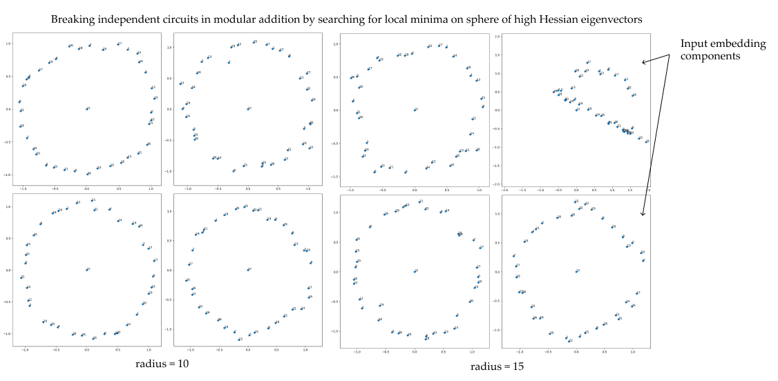It was the biggest surprise to us in the course of our experimentation that the unsupervised decomposition and steering methods can be made to work (we at first tried setting it up many times in many different contexts and kept being unable to make it work). We plan to explain in a later installment why this is so much harder than the "supervised" approach: why it is not possible to simply split the Hessian eigenvalues for the "combined" algorithm into "good" and "bad" generalizations and how we carefully designed a new "sphere search" neural net on top of a very simple and interpretable model (modular addition) to solve this task finally. But we believe that including a full description here would make an already long exposition unreadable. For now, we simply say that the algorithm works by executing a "sphere search" algorithm (another neural net built on top of the original one) which "pushes" solutions to move out of the local minimum along certain Hessian eigendirections; eventually, this exerts breaking "pressure" on the various component modules, and at a finite point, we expect (and, in our nice setting, observe) a symmetry-breaking phase transition which forces one of the modules to break, and thus become interpretable.